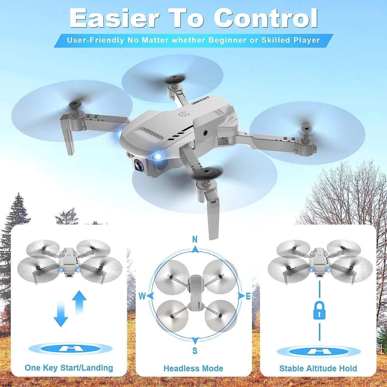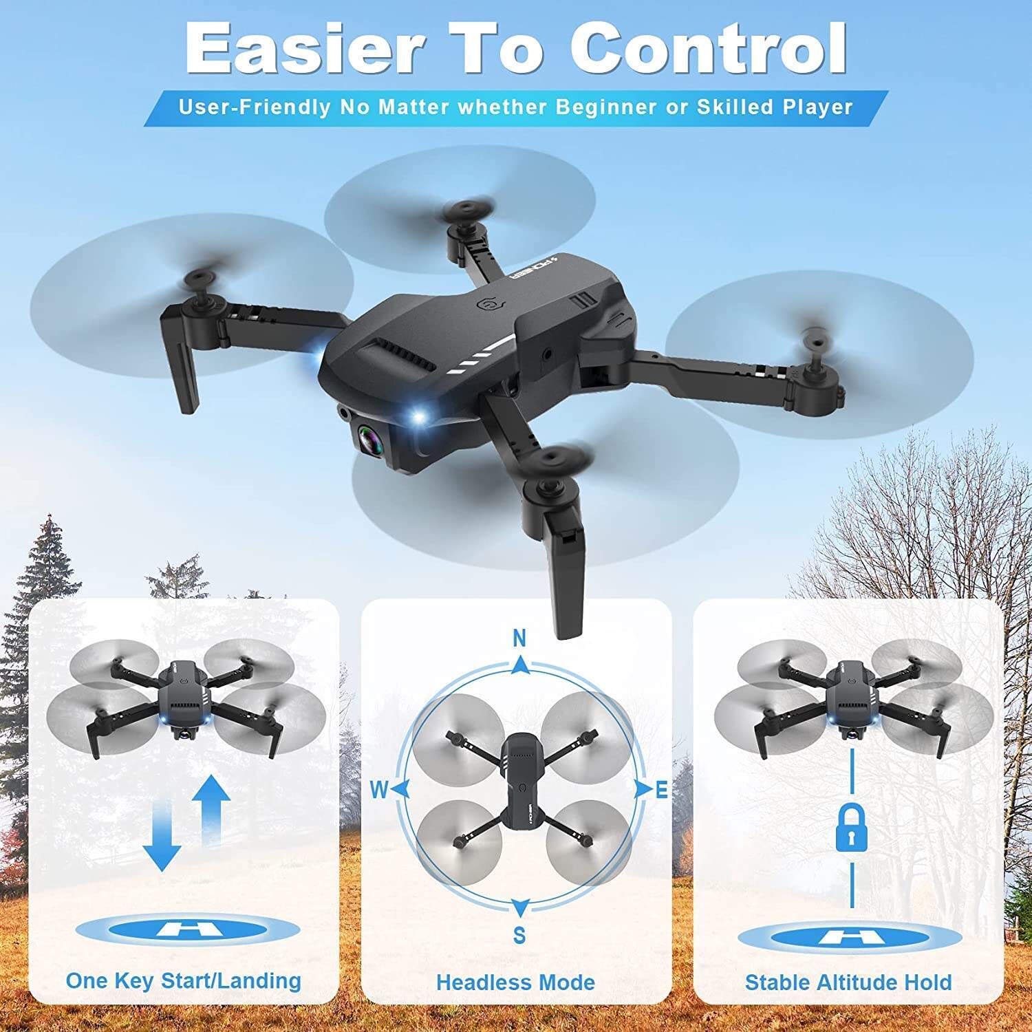 - 【Easy To Use with Stable Altitude Hold Function】: Just click the one key take-off/landing button to start flying. Compared to other drones of the same type, we have a more powerful engine, and more stable hover technology, the Altitude Hold function can keep the drone at a certain altitude for easy control fly, and shoot high-quality footage.