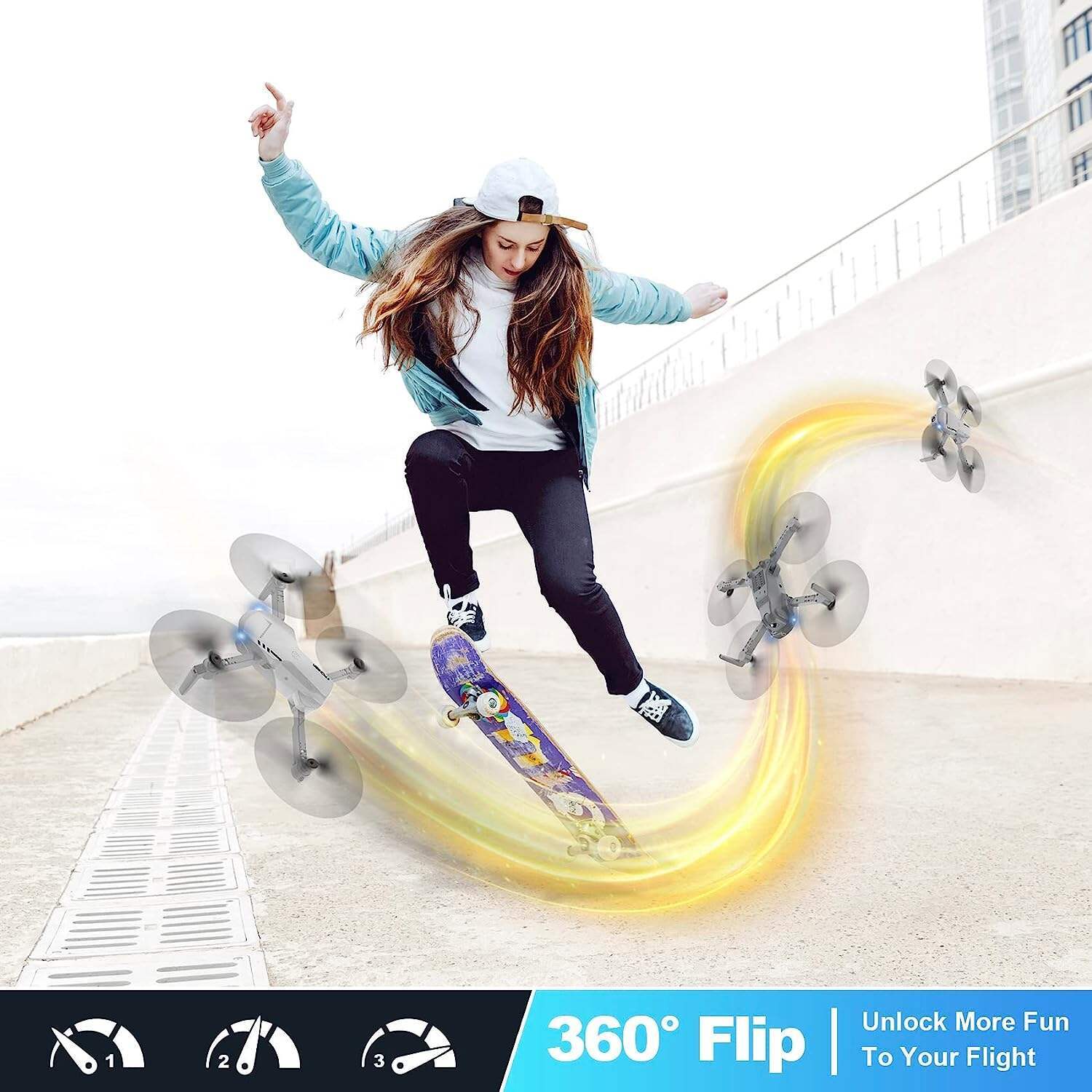 - 【Multiple Functions Fit Your Need】: High-Speed Rotation, Circle Fly, 3 Speed Gear(The speed button is on the Top Right of the Controller, Not the left joystick), Gesture Control, Headless Mode, One Key Take off/ Landing, Altitude Hold, 3D Flip, Low battery warning, Emergency Stop. All its functions and great quality make it not only suitable for beginners, but also skilled players.