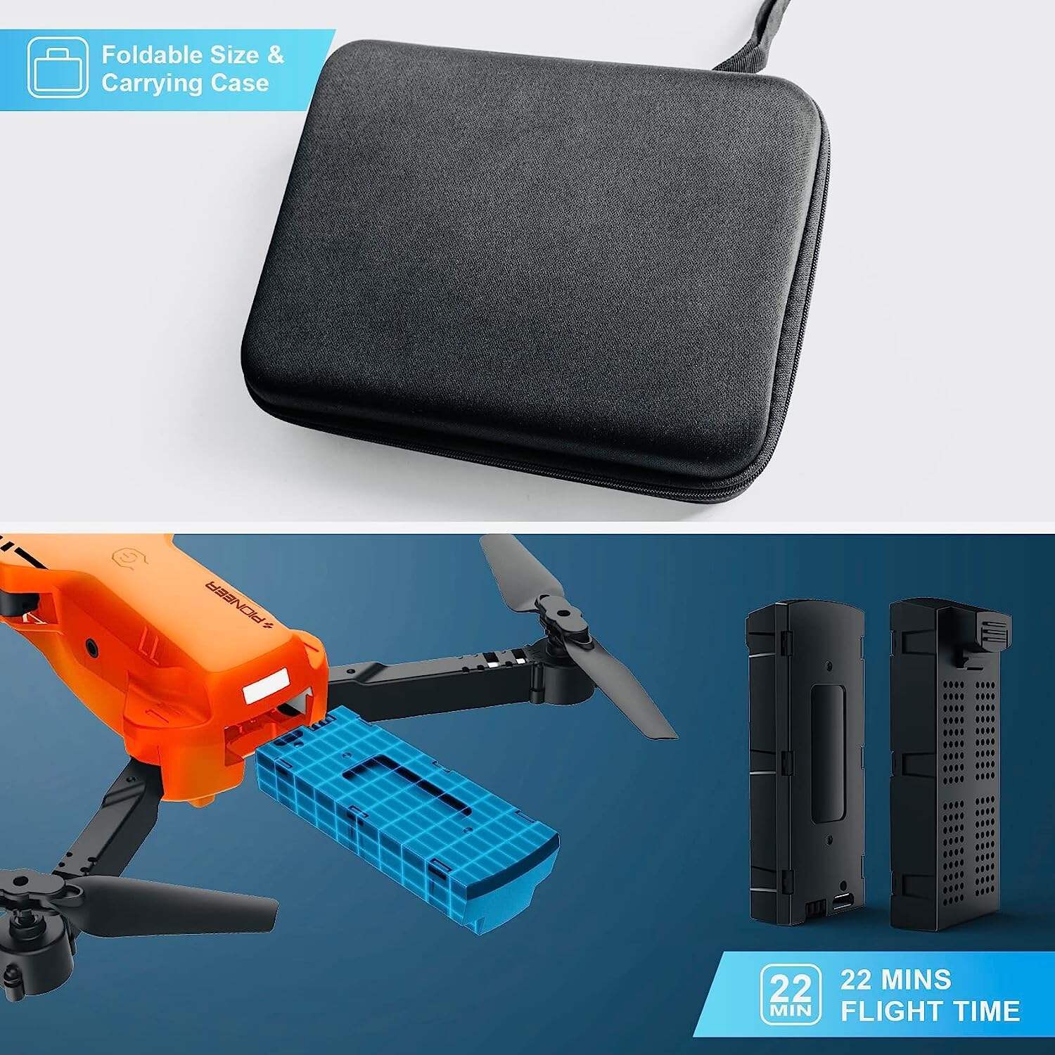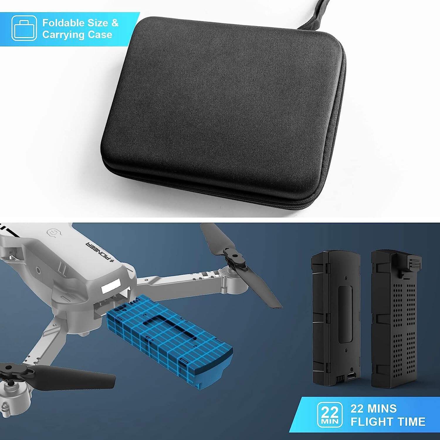 - 【Larger Body Size & Full Accessories】: The package comes with a carrying case that is convenient for outdoor travel. With 2pcs 800mAh batteries, even its the body is larger than other drones, it can last for 22 minutes. Equipped with controller batteries, propeller guard, and spare fan blades, making this drone stands out in its class. It is also a good choice for gifts.
