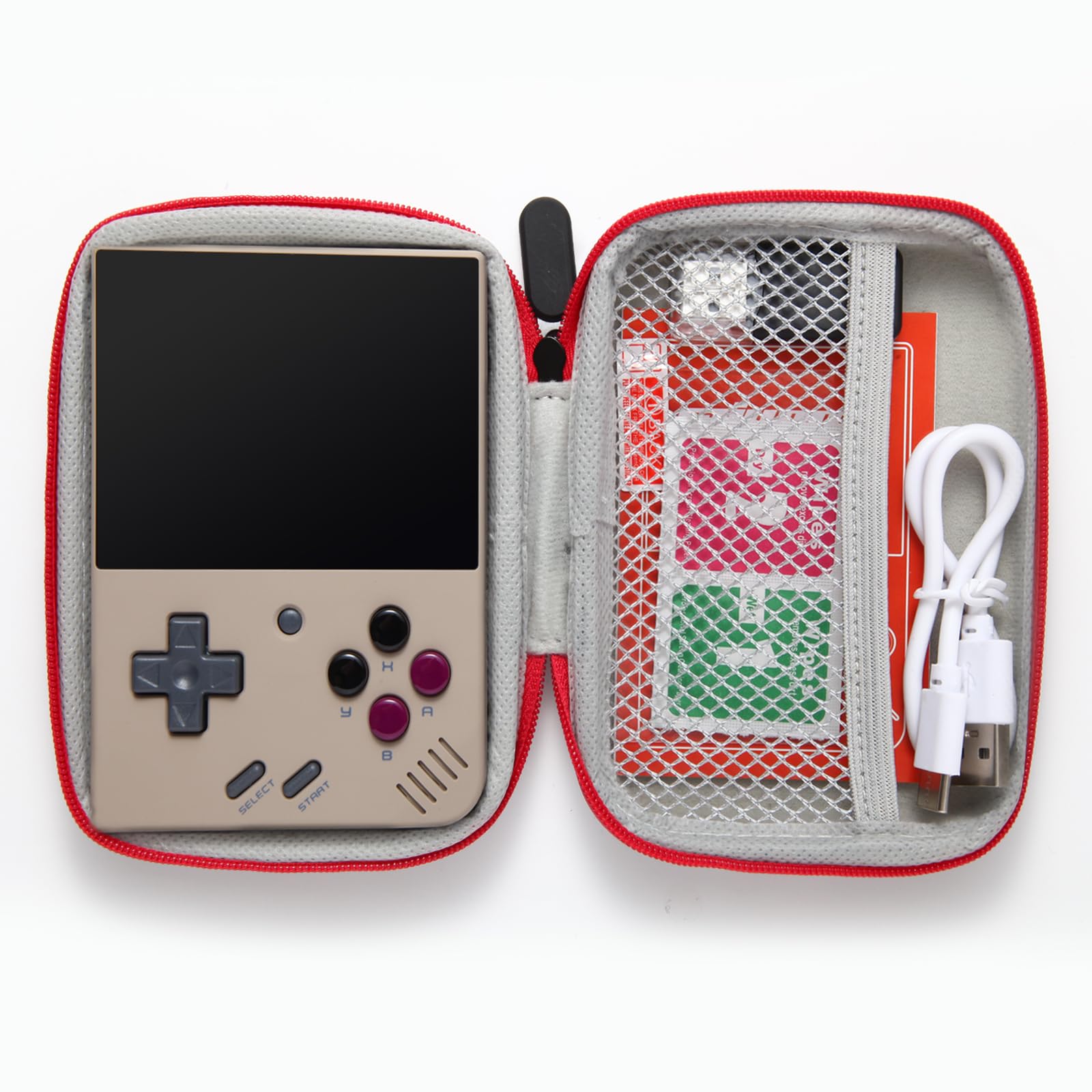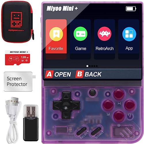 - u3010Packing Listu3011Miyoo Mini Plus Game Console x1, Storage Bag x1, 128G TF Card x1,Tempered Glass Screen Protector x1, Type-C Data Cable x1, Card Reader x1, UserManual x1.
