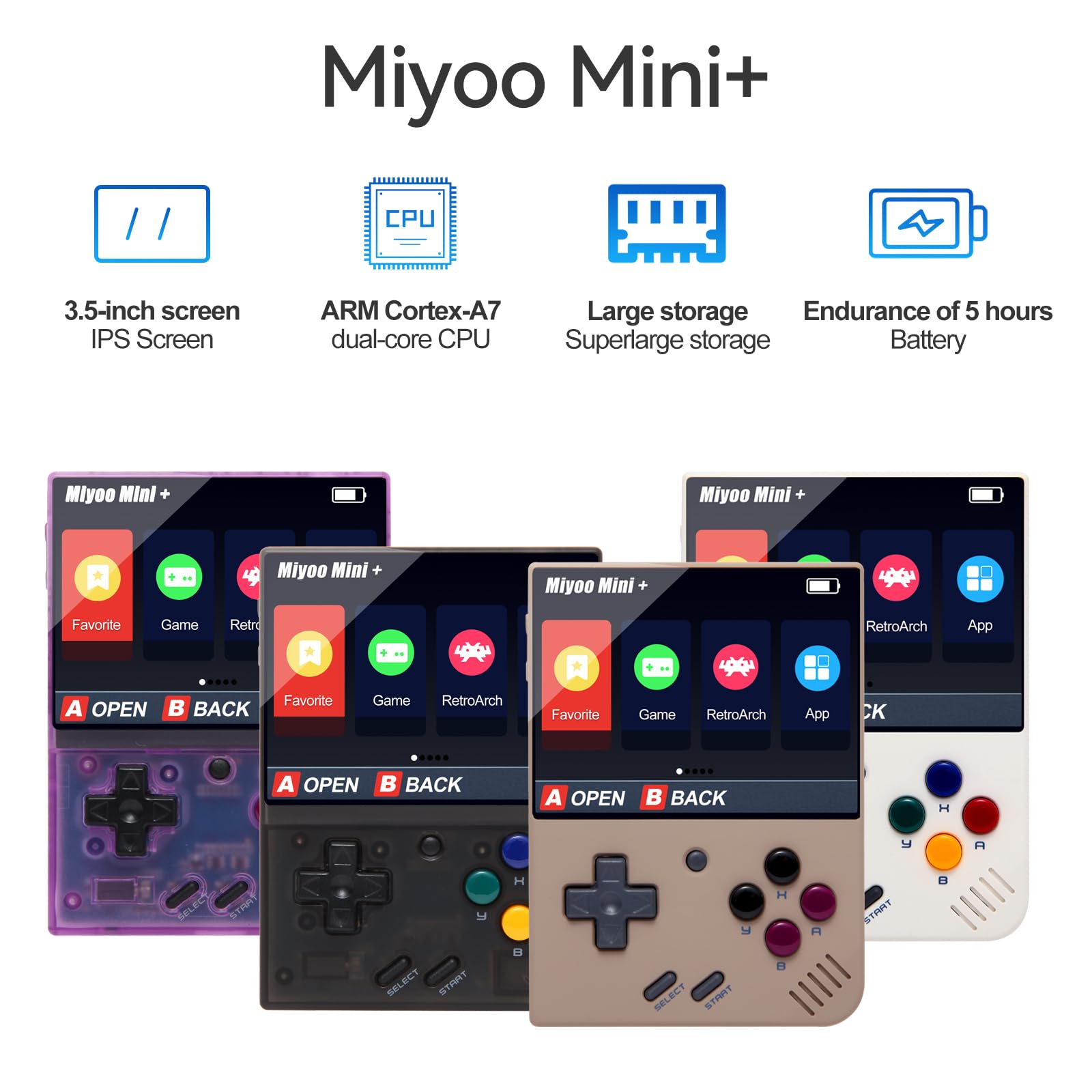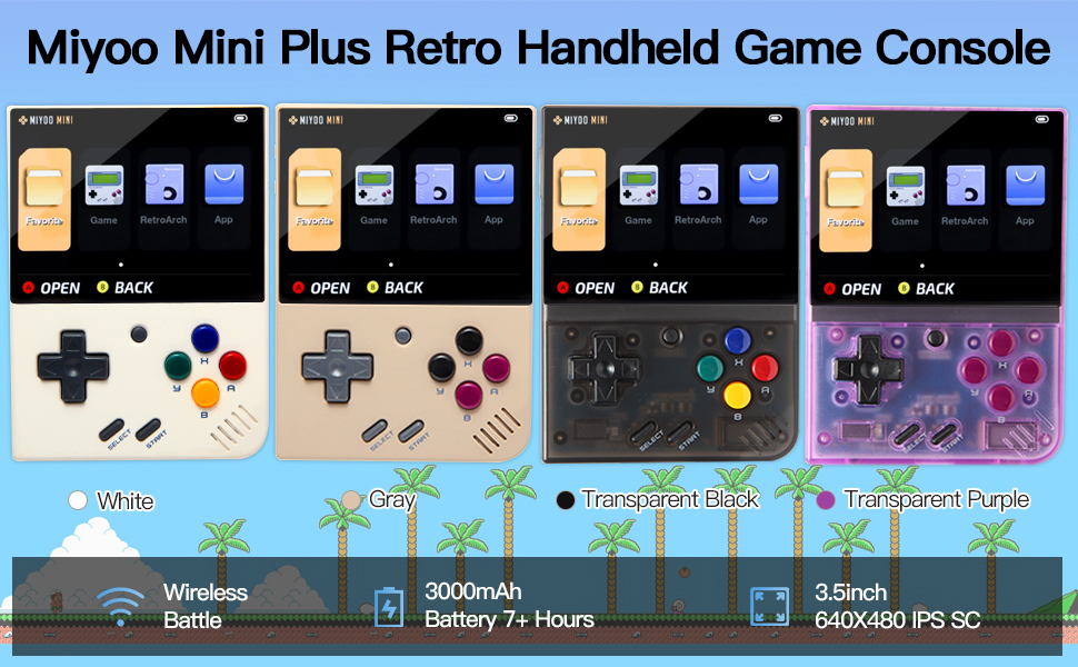 - u30103.5-inch IPS Screen & 3000mAh batteryu3011Miyoo Mini Plus has 3.5-inch IPS HD high-definition retina screen, 640x480 high-resolution, full-fit process, transparent and gorgeous picture, ultra-narrow border. equipped with 3.7V 3000 mah efficient lithium battery, use for 7-8 hours.