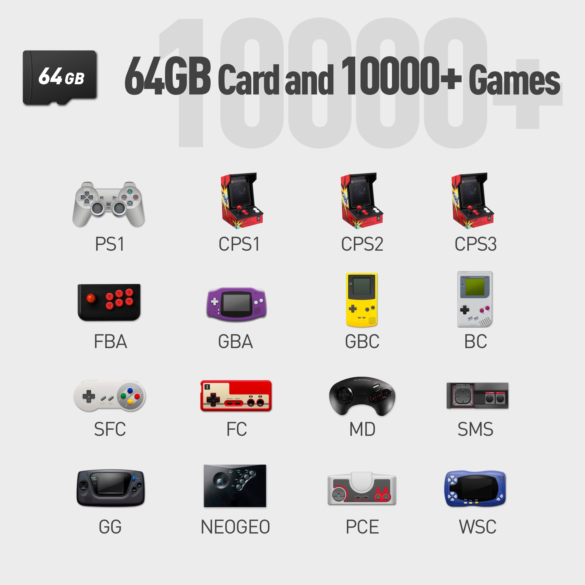 - ud83cudfaeu3010Built-in multiple emulatorsu301164G TF card pre-loaded 10,000+ classic games. Including FC, GB, GBA, MD, SFC, PS, MS, WSC, PCE, NGP, ARCADE , FBAHACK, FBN, MAMEPlus, NEOGEO, OpenBOR, PicoDrive, SmsPlus, etc., support the open source RetroArch system, it also supports users to download games in relevant formats.