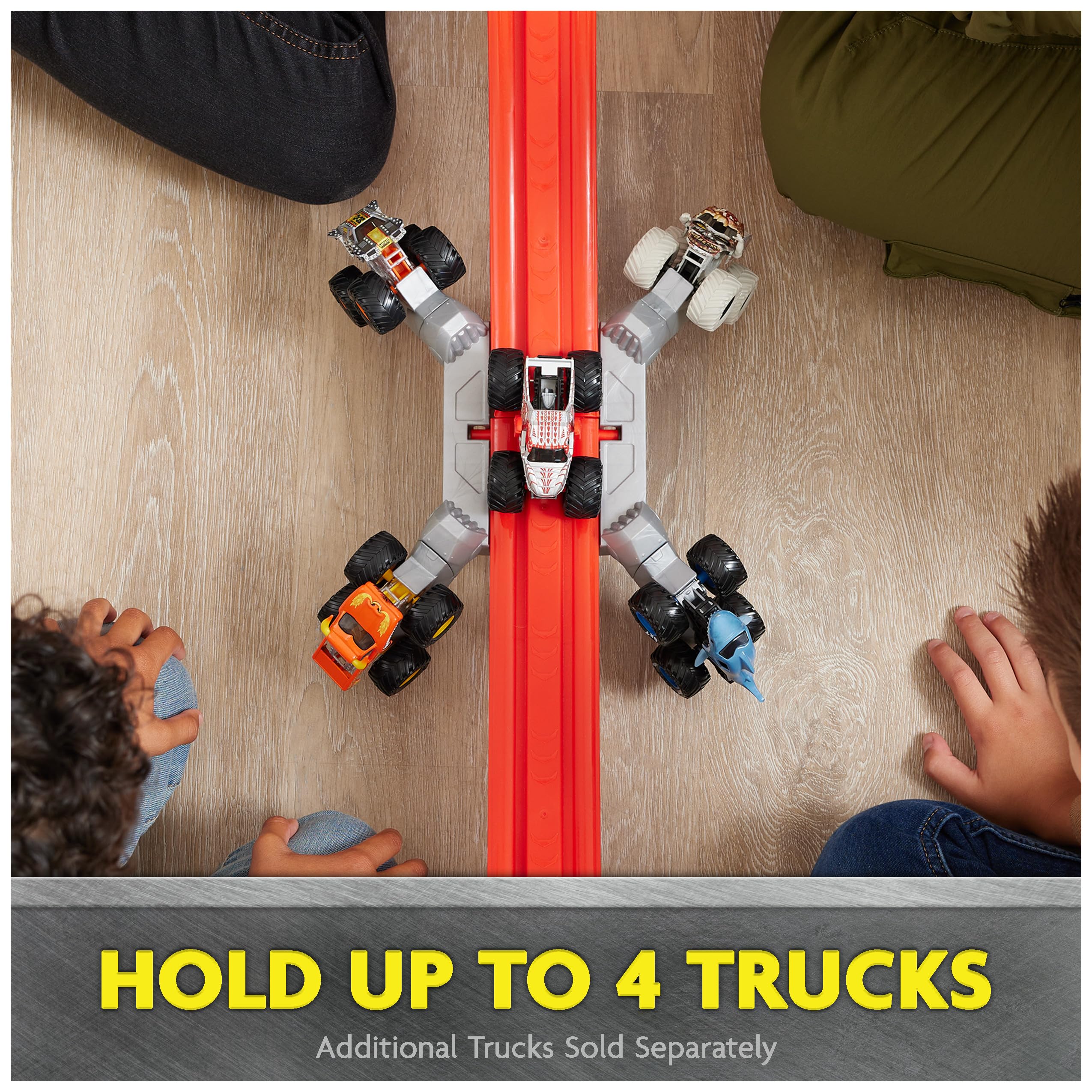 - Includes: 1 1:64 Scale Monster Jam Truck, 1 Wall Bracket Top, 1 Wall Bracket Bottom, 7 Large Command Strips, Monster Jam Sign, Top Triangle Mount, Bottom Triangle Mount, 2x Crank Arms, Folding Main Track, 3 Track Pieces, Track Support, 4 Track Support Legs, Stunt dial Assembly, Feature Dino Head, Left Bottom Jaw, Right Bottom Jaw, Left Arm, Right Arm, Sicker Sheet, Landing Ramp, Landing Ramp Frame, 3 Instruction Sheets