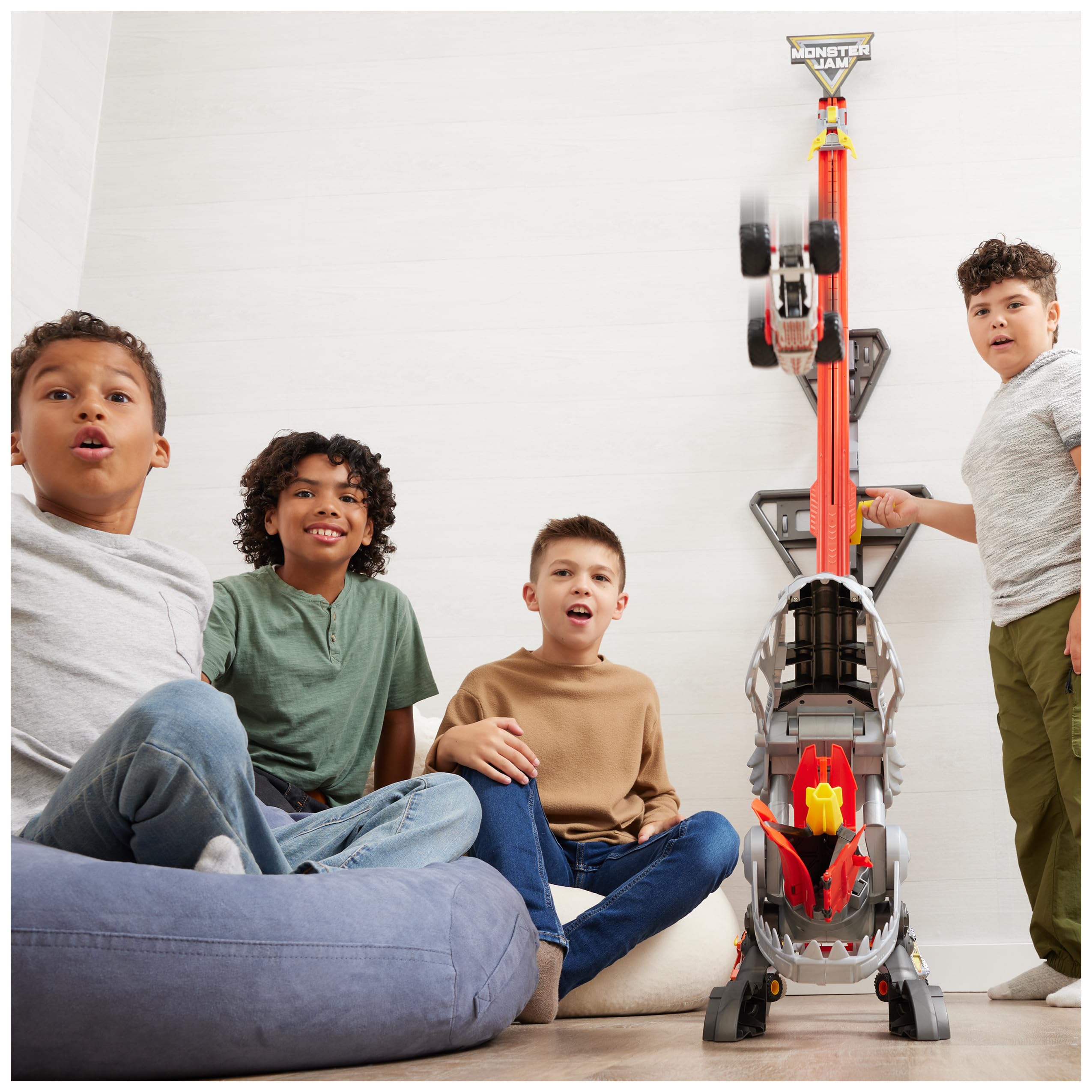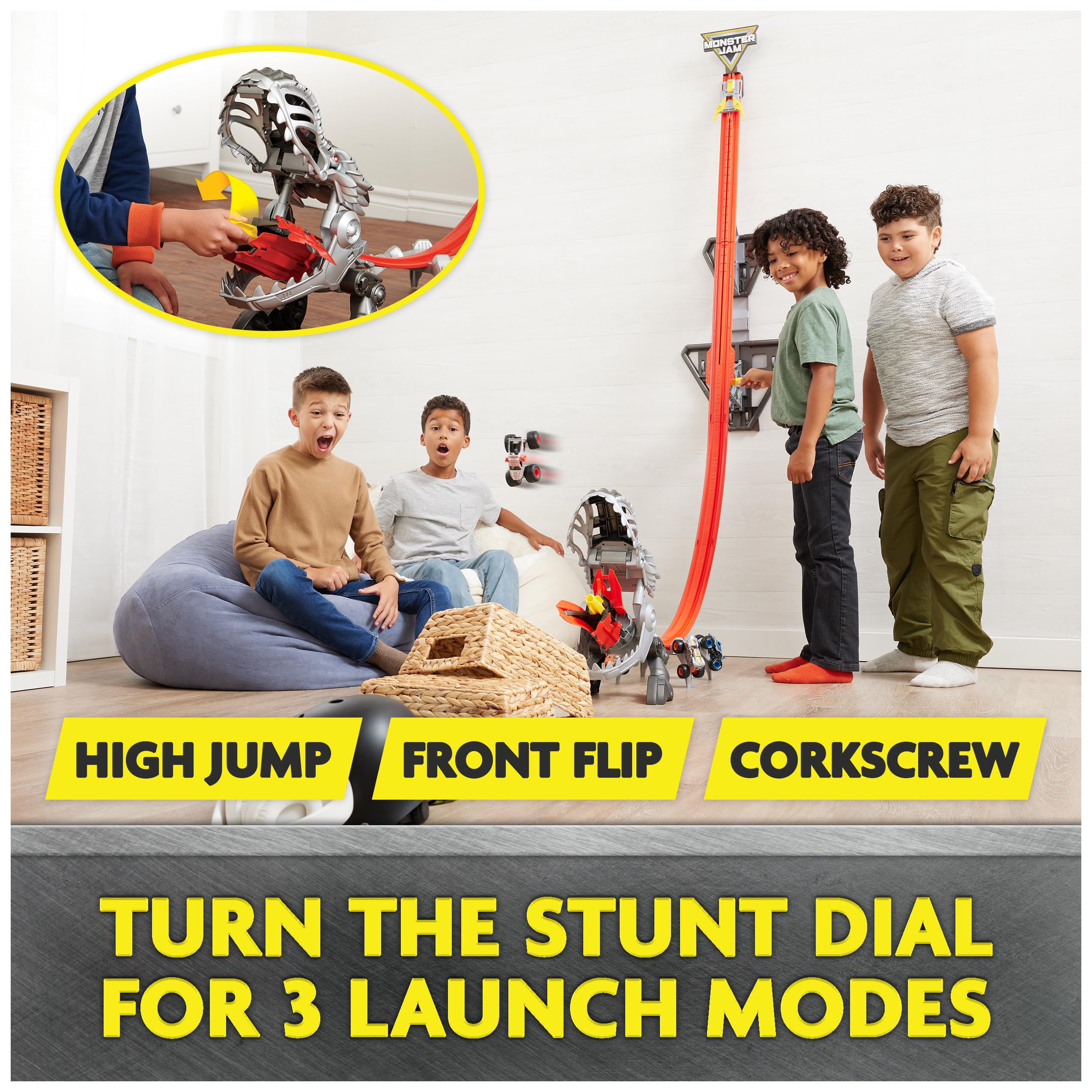 - 3 LAUNCH MODES: Load and crank your favorite Monster Jam trucks to the adjustable launch ramp. Once it reaches the top, perform awe-inspiring moves like a high jump, front flip, or corkscrew with turn of the stunt dial in the Dinou2019s mouth.