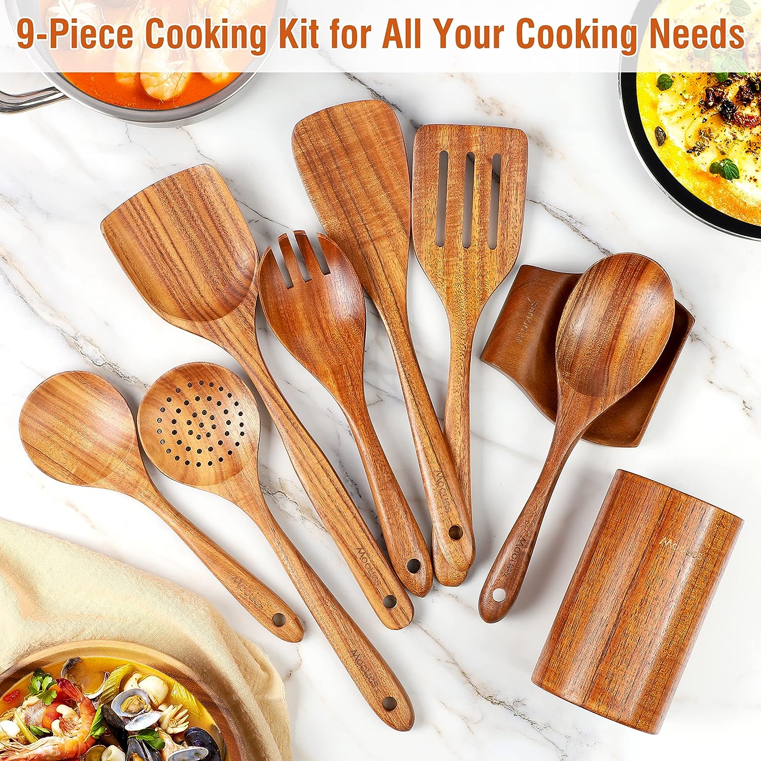Mooues 9 Piece Natural Teak Wooden Kitchen Utensil Set with Spoon Rest - Comfort Grip Cooking Spoons and Utensils Holder