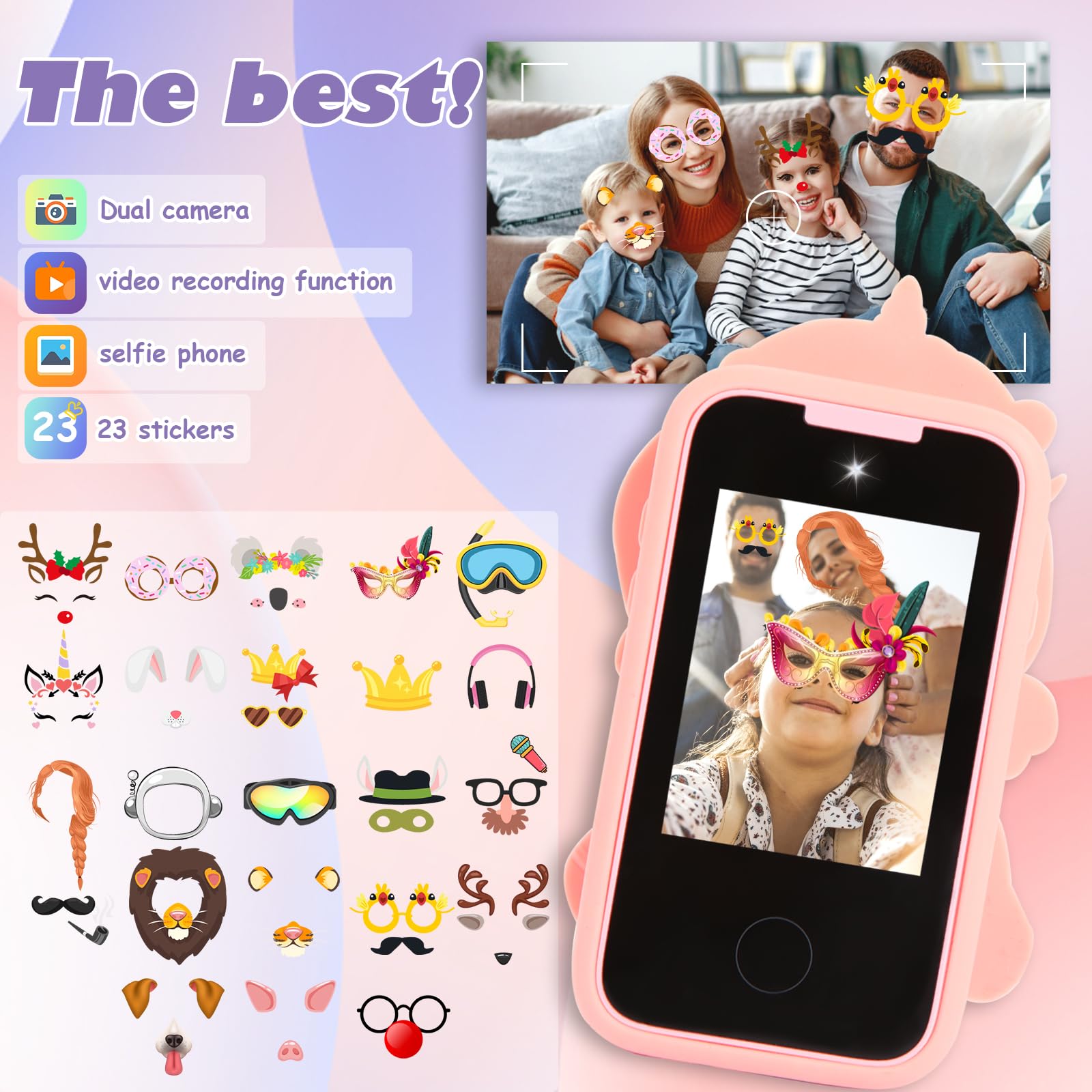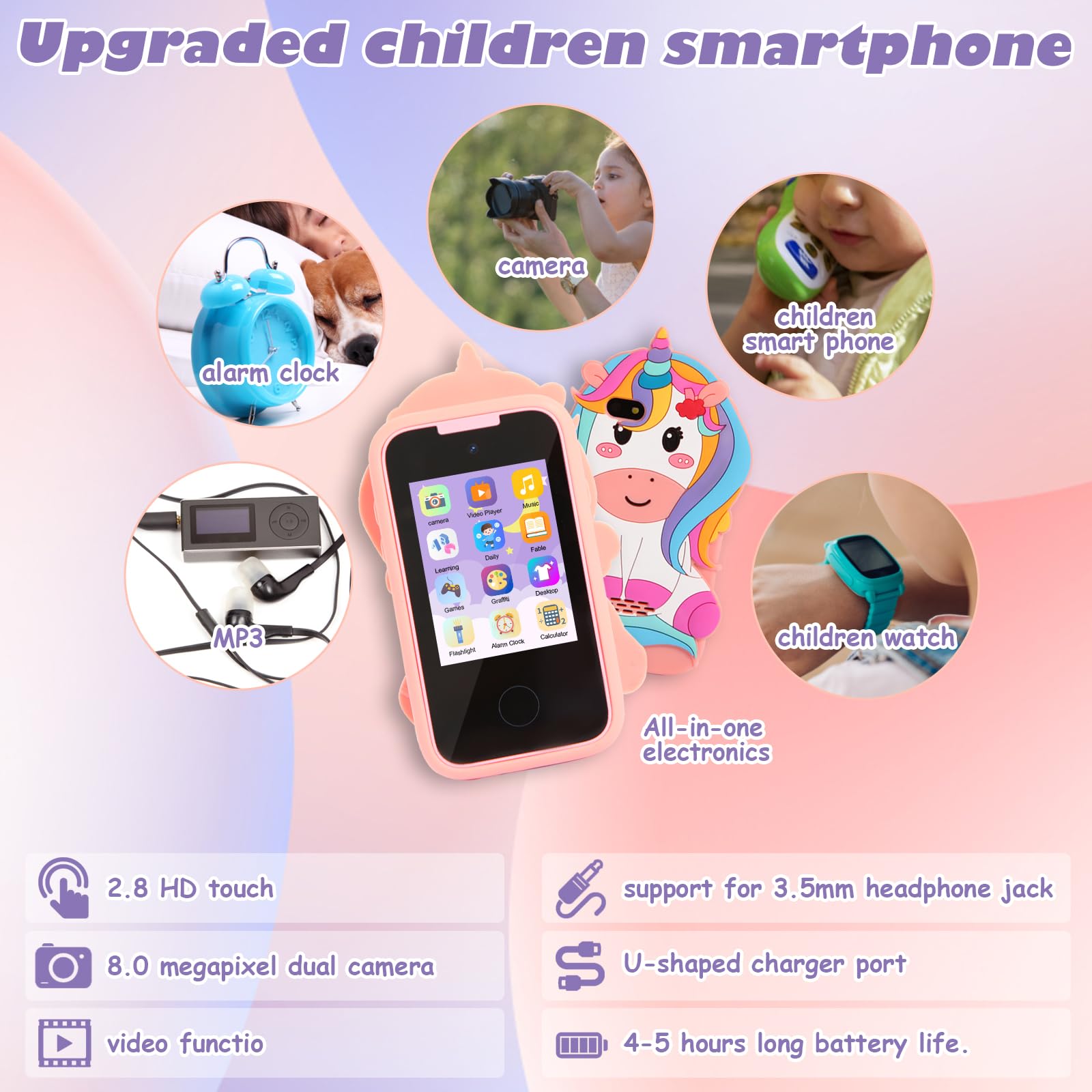 - [Next-Gen Kid's Smartphone] Introducing our new and improved, kids-friendly smartphone with a 2.8" touchscreen, a powerful 8.0-megapixel dual camera, autofocus, and video functions. Encourages children to take creative photos with stickers and share their world with loved ones. The high-quality speakers and a 3.5mm headphone jack opens up a world of immersive learning and music.