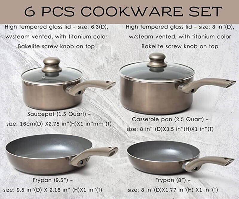 COMPLETE KITCHEN SET: The kitchen pots and pans set includes 1pc saucepot (1.5 Quart), 1pc casserole pan (2.5 Quart), -1pc frypan (8"), 1pc frying pan (9.5"), and two high tempered see-through glass lid that is heated and shatters resistant which prevents splatters, that is exactly the nonstick cookware sets that you need for your day-to-day cooking.