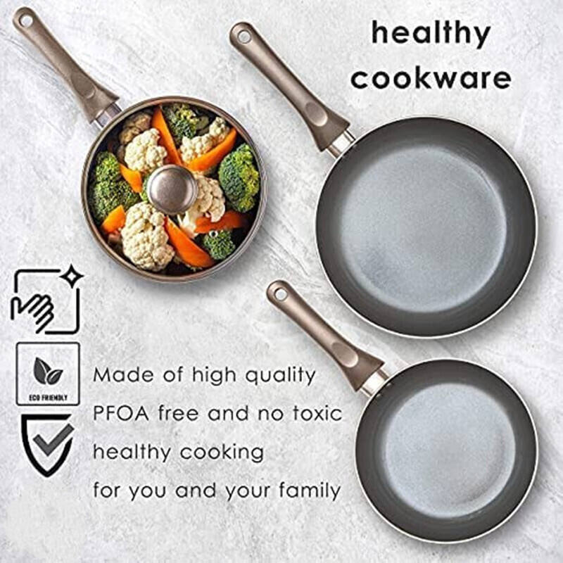 MAXIMUM COMFORT: The pot and pan Set is made in lightweight aluminum that retains perfect heat and has a much stronger protective layer than regular metal pots and pans that making it corrosion and scratch resistant and easy to use, as well the handle can "stay cool" prevent hot, Bakelite handle with earring designed- comfort for grip and safety, mainly easy to let you hang on any place.
