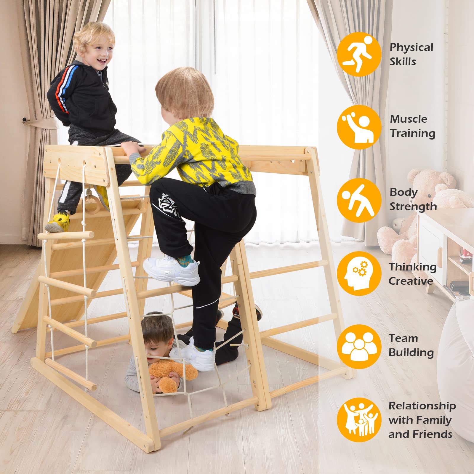 - Creativity: Indoor toddler climbing toys Montessori comes with kids indoor playground equipment setthat can be tilted as needed to baby gyms, freestanding, climb and slide. And can not only strengthen creativity experience, independent playand cooperative play, fine motor skills and quality life. This is the prefect toy to accompany you kids to grow up