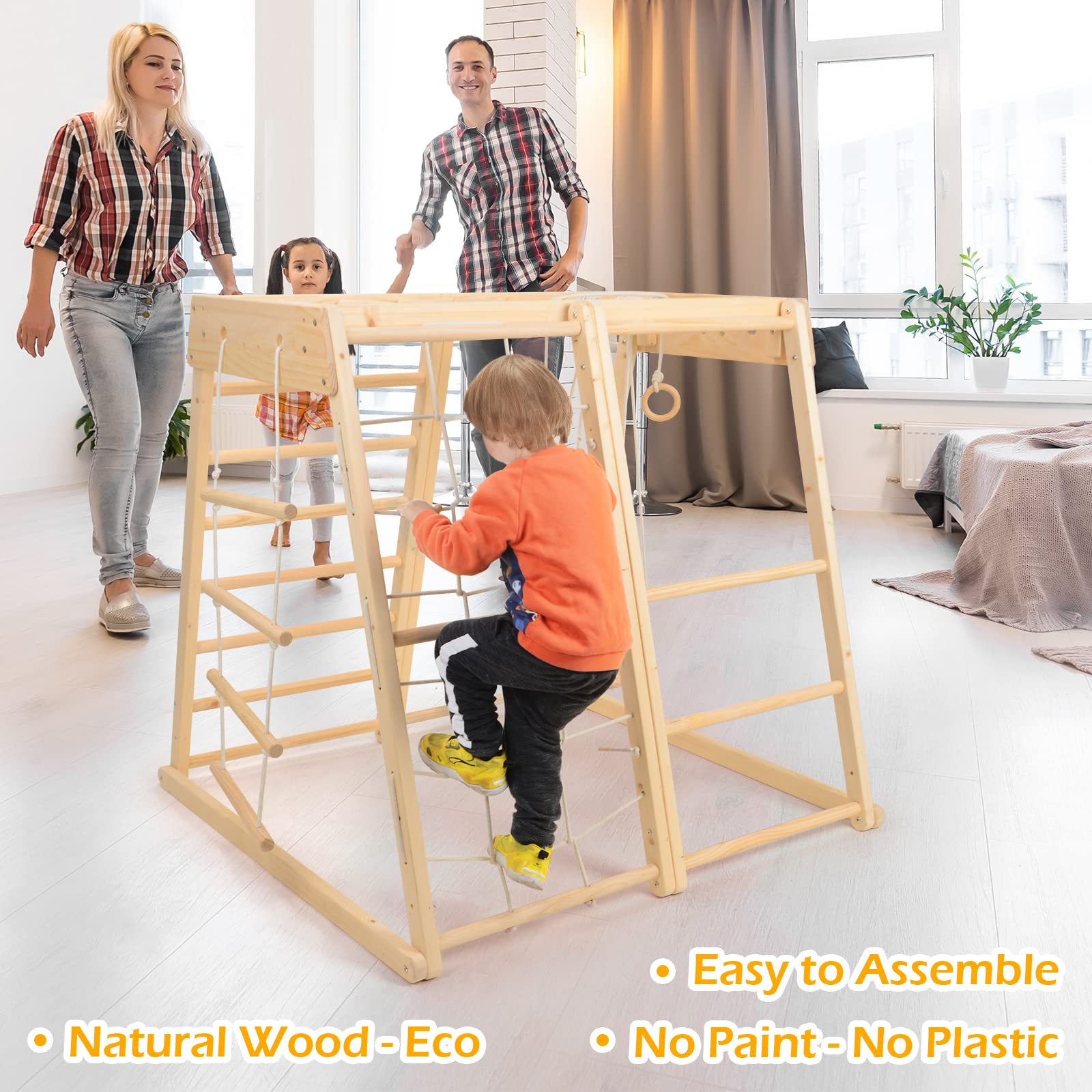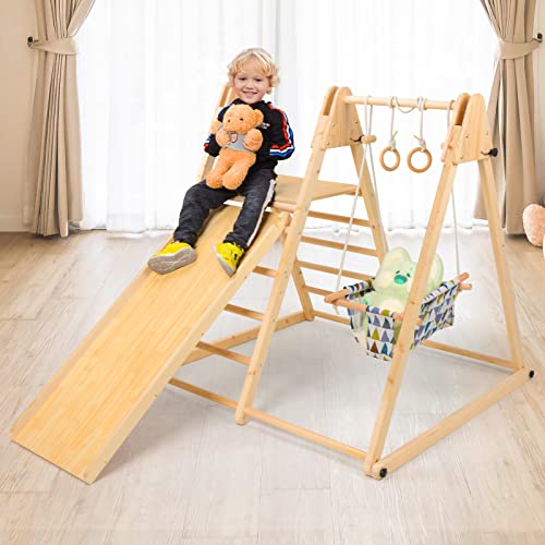 - 9-in-1 multi-function: This indoor playground offers Indoor Jungle Gym, Pickler Triangle ramps, Slide, Swing, Geo dome, Monkey bars, rock wall and Swedish rope ladder which is intended for domestic indoor and outdoor use. All activity elements are appropriately sized for toddlers and kids. And create the area for kids and parents to play together and enjoy the family time