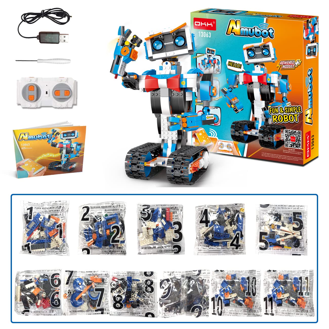 - INCLUDE 635 OKK PIECESu2014u2014Our stem toys includes 635 pieces of building blocks. Comes with a picture guide instruction to help children build the robot toy step-by-step.The building toys is made of safe and harmless ABS plastic.Flexible left, right, front, back, and 360-degree rotating stunt. Remote control distance up to 65Ft.