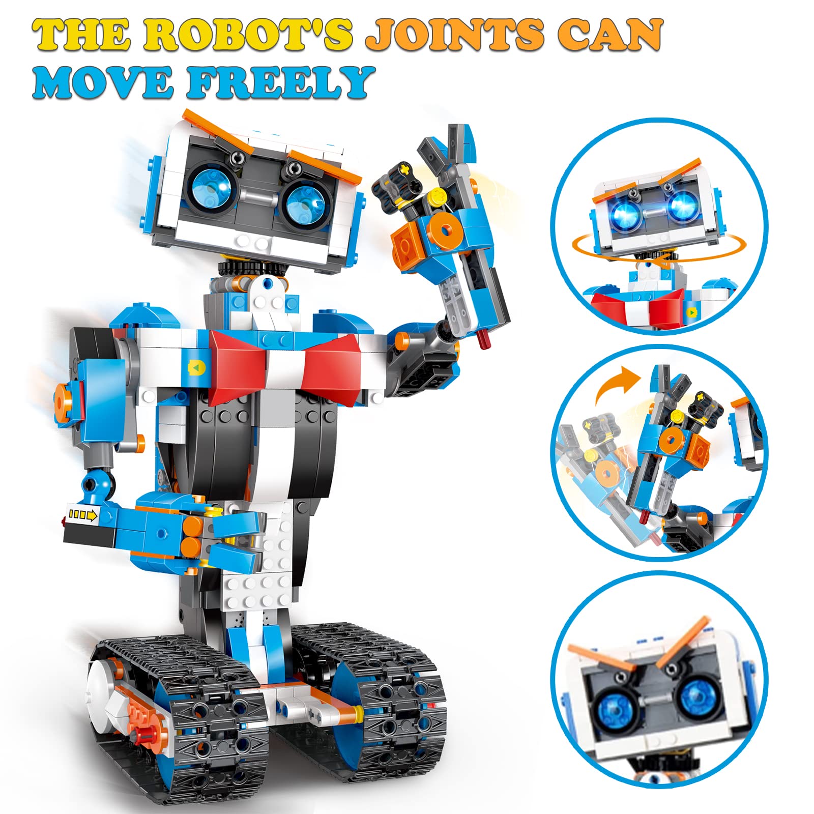 - REMOTE AND APP CONTROLu2014u2014Robot building kit can controlled by the phone APP bluetooth connection. With remote control mode, path mode, voice control, gravity sensor and stem programming,four remote control modes. This stem projects for kids joints are free to move, the head, shoulders, arms, elbows, tracks and eyebrows can be rotated, various expressive expressions can be arbitrarily placed.