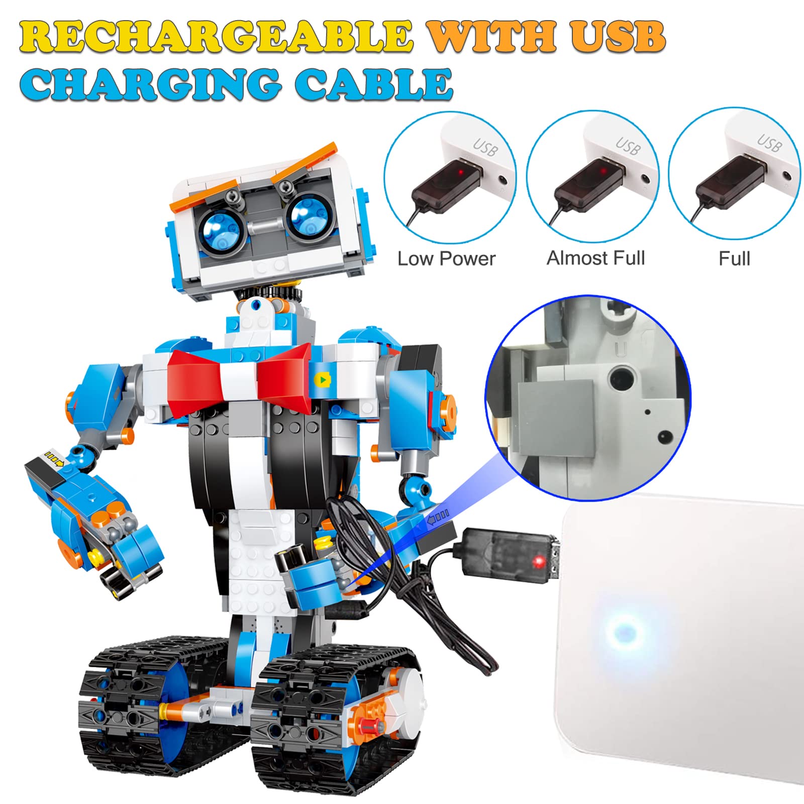 - USB RECHARGEABLE DESIGNu2014u2014USB charging design equipped with built-in rechargeable batteries in the stem robot.u00a0Comes with a 2.4GHz remote controller that has a range of 65ft radius and can move the robot in all directions (left, right, forward, backward, and full 360 rotation). Note : Remote control requires 2 AAA batteries ( Not included ).