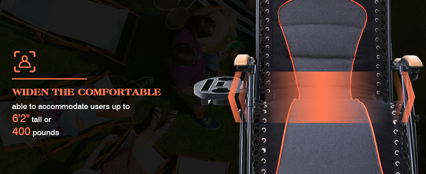 - Zero Gravity Reclining Chairs: The Length of extra long chair when fully reclined is large enough for big and tall people 6'2". Strong double bungee rope and stainless steel tube frame are durable for using a long time. The maximum loading capacity is 400lbs
