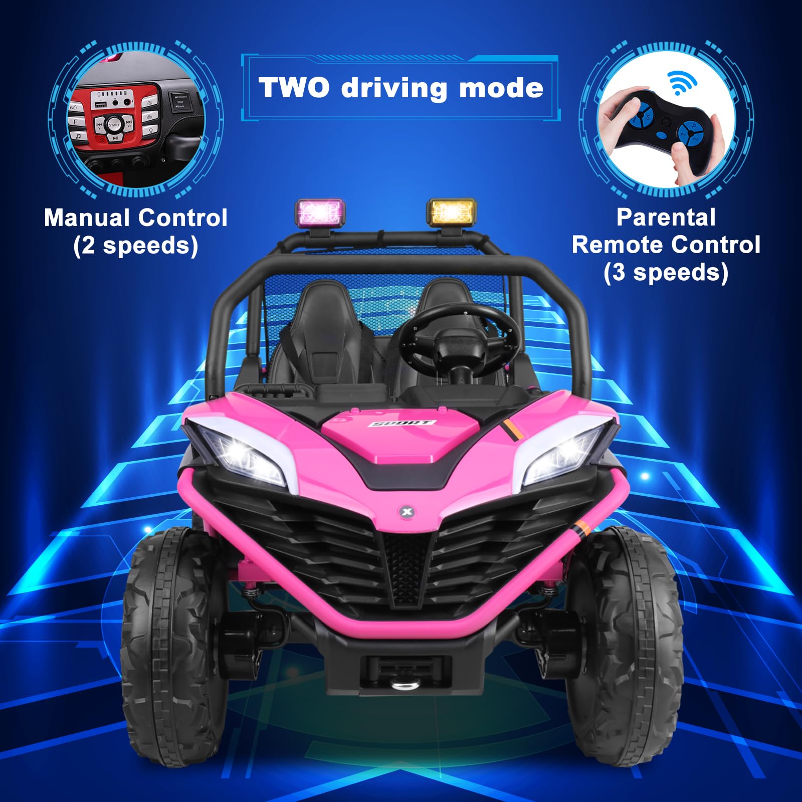 - Multi-functional uff1aThis ride on car have a one-touch start button with speakers and music, as well as Bluetooth that connects to your cell phone to make driving a joyful and cheerful.The details such as LED lights and searchlights, a power display on the center console, and forward and reverse switches make it more practical and accessible.