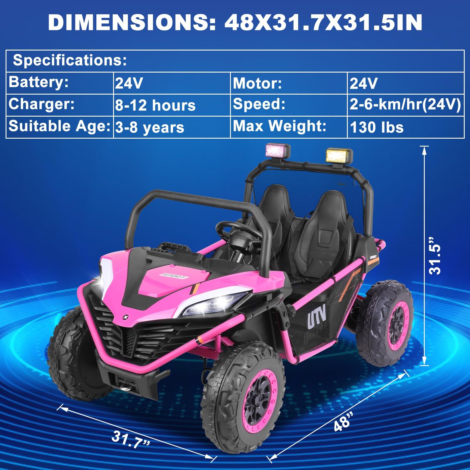 - Specification:Large size: 48in(L) x 31.7in(W) x 31.5in(H); Item Weight:75 lbs; Maximum Load: 130lbs; Motor:4X80W; Battery:rechargeable 24V10AH battery; Charging time of 8-12 hrs; Recommended for ages: 3-8 years; Assembly Needed.