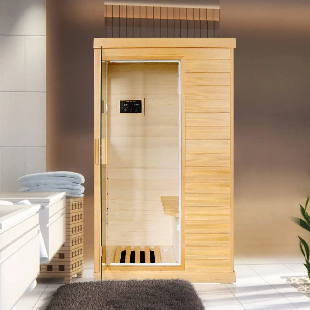 Good materials:This gorgeous sauna is constructed with high-quality Natural Canadian Hemlock wood. A beautiful and durable wood that serves as an excellent heat insulator. Its glass is tempered for reliable longevity. The intelligent entertainment system is equipped with two high-quality speakers.Small size, low space requirements. Convenient and worry free. Bluetooth code: 0000 Benefits from far infrared spa:Lowers blood pressure. Detoxifies and increases blood circulation. Alleviates joint pain, ease pain from sore muscles or aching joints. Besides burning calories, improves skin tone among other benefits. When you are play game on your mobile phone, watch movies, enjoying the book, magazine, TV show, your weight is losing and your body is sharping.It can be adjust during 68掳F-140掳F. Low-EMF far infrared: 800W Low rated EMF/EMR infrared sauna. 5 high efficiency and environmental protection infrared carbon ultra low EMF energy efficient heating panels surround your body. The bottom heating plate is independently controlled to keep the soles of the feet hot. The temperature will not change after reaching the set temperature. Automatic temperature adjustment, humanized temperature control system.800W-power saving, low electricity charge.Size:61.61*35.24*27.56. Safety protection:You can adjust the temperature according to your needs with the control panel. With the automatic timer option, you can easily determine the length of time that suits you. Features timer and power adjustment, Temperature setting protection, system protection, hardware protection. Global service: Our products enjoy a 7 year after sales service. You only need to do a simple installation. The seats and foot grids are sprayed with water-based paint, which does not contain harmful substances. After use, simply wipe them with a towel. They are clean and tidy