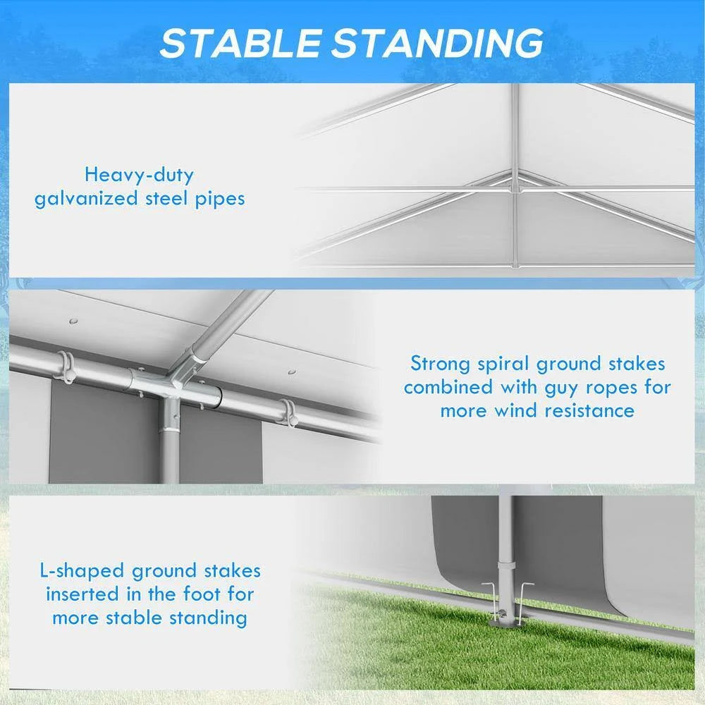 Outsunny's 20' x 20' carport and party tent can protect your project car and transform any outdoor area into a unique event space. Excellent for wedding receptions, graduation parties, or extra-large barbeques, it offers six stylish cathedral-esque windows. Excellent for small-to-medium cars, boats, furniture, and tools, it stops sun damage and sunburns alike. Made of a galvanized steel frame selected to withstand water and warping, Outsunny's canopy tent provides portable protection.