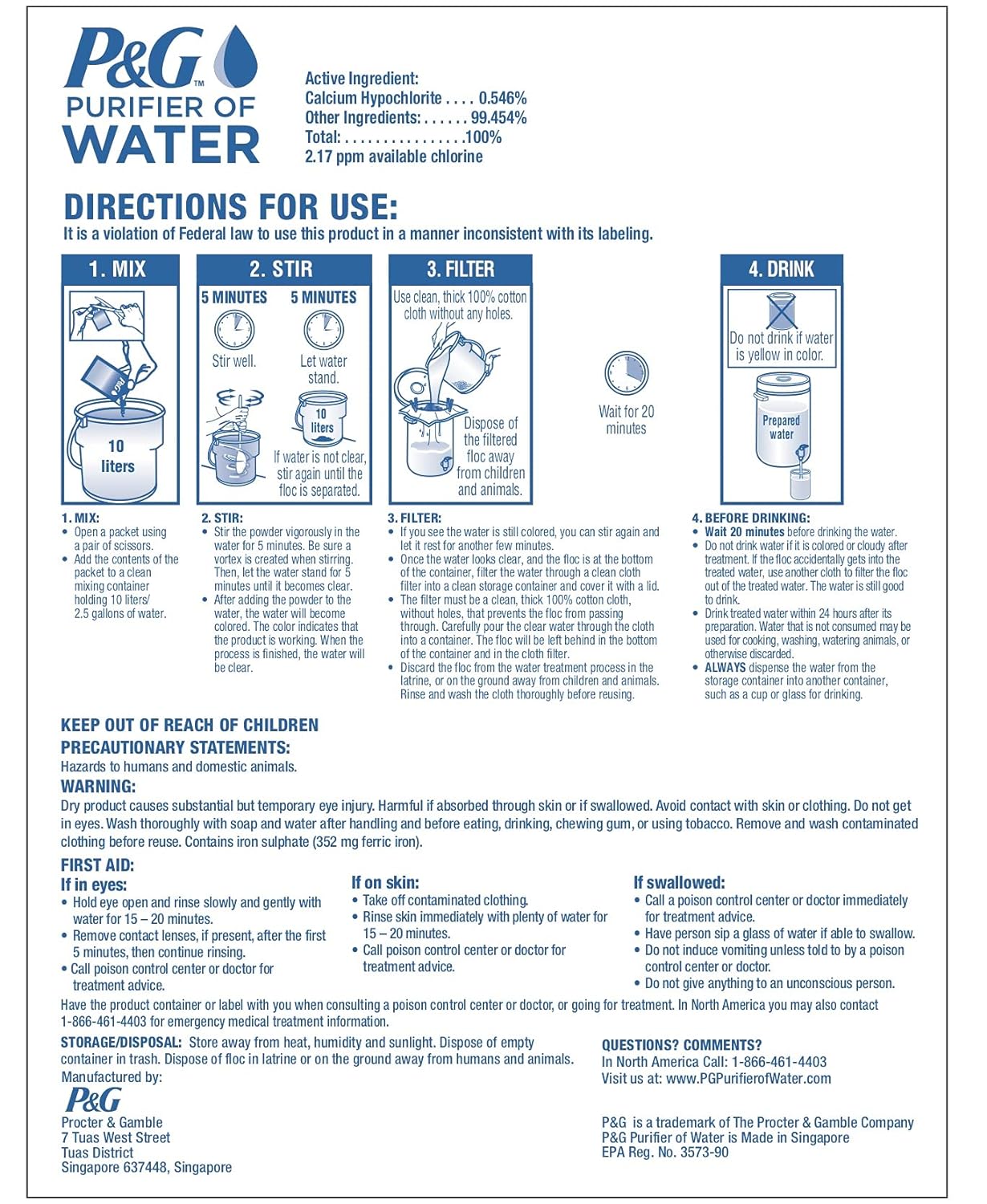 - SURVIVE OUT THERE - As an emergency water purifier, P&G water purification packets slip easily into your preparedness kit. These small pouches treat water for your whole family on the trail.