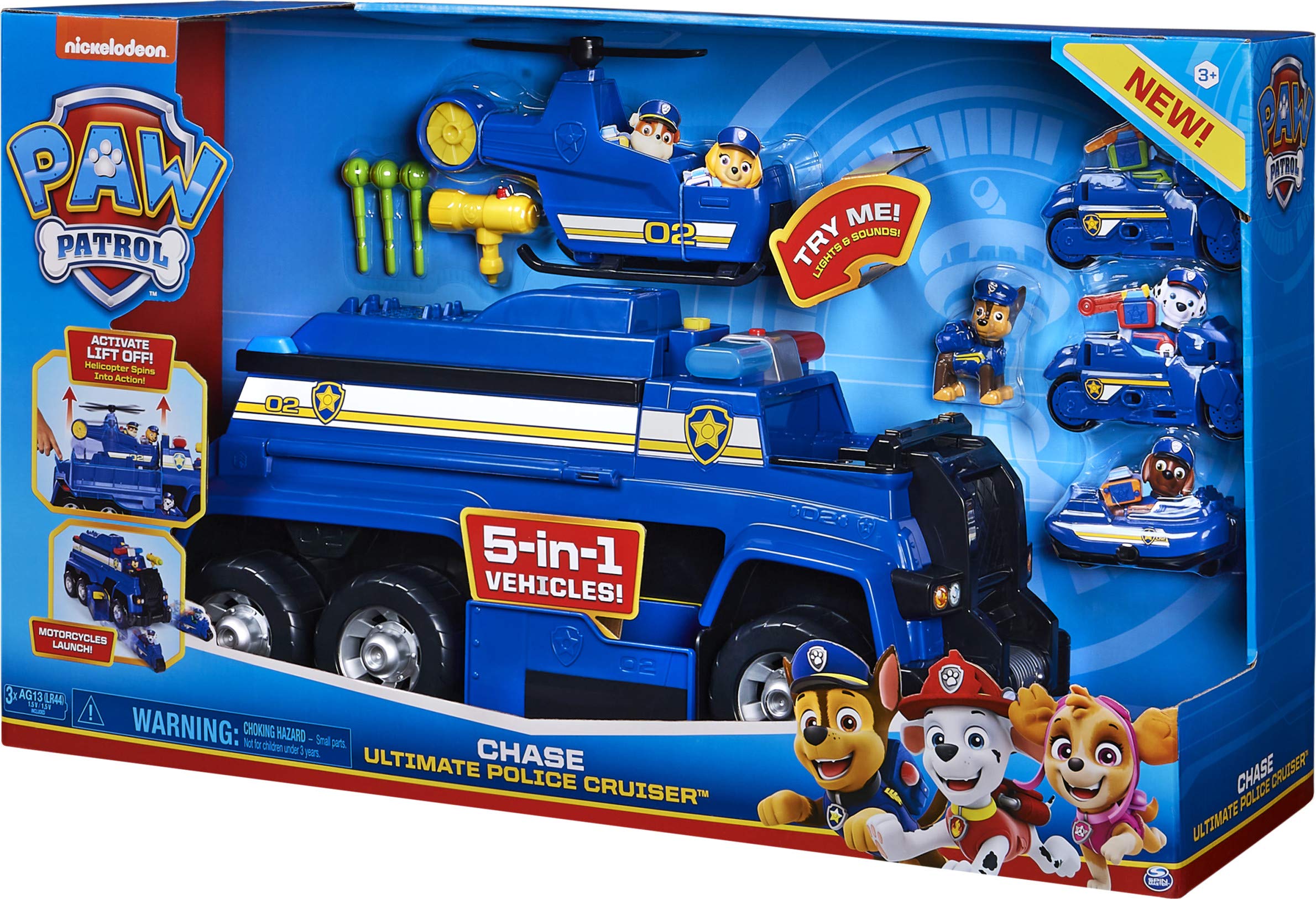 - 5-IN-1 CRUISER: This large cruiser has room for all 6 pups and is equipped for any rescue, with 5 different vehicle toys! Save the day in the cruiser car, 2 motorcycles, a boat and a helicopter!