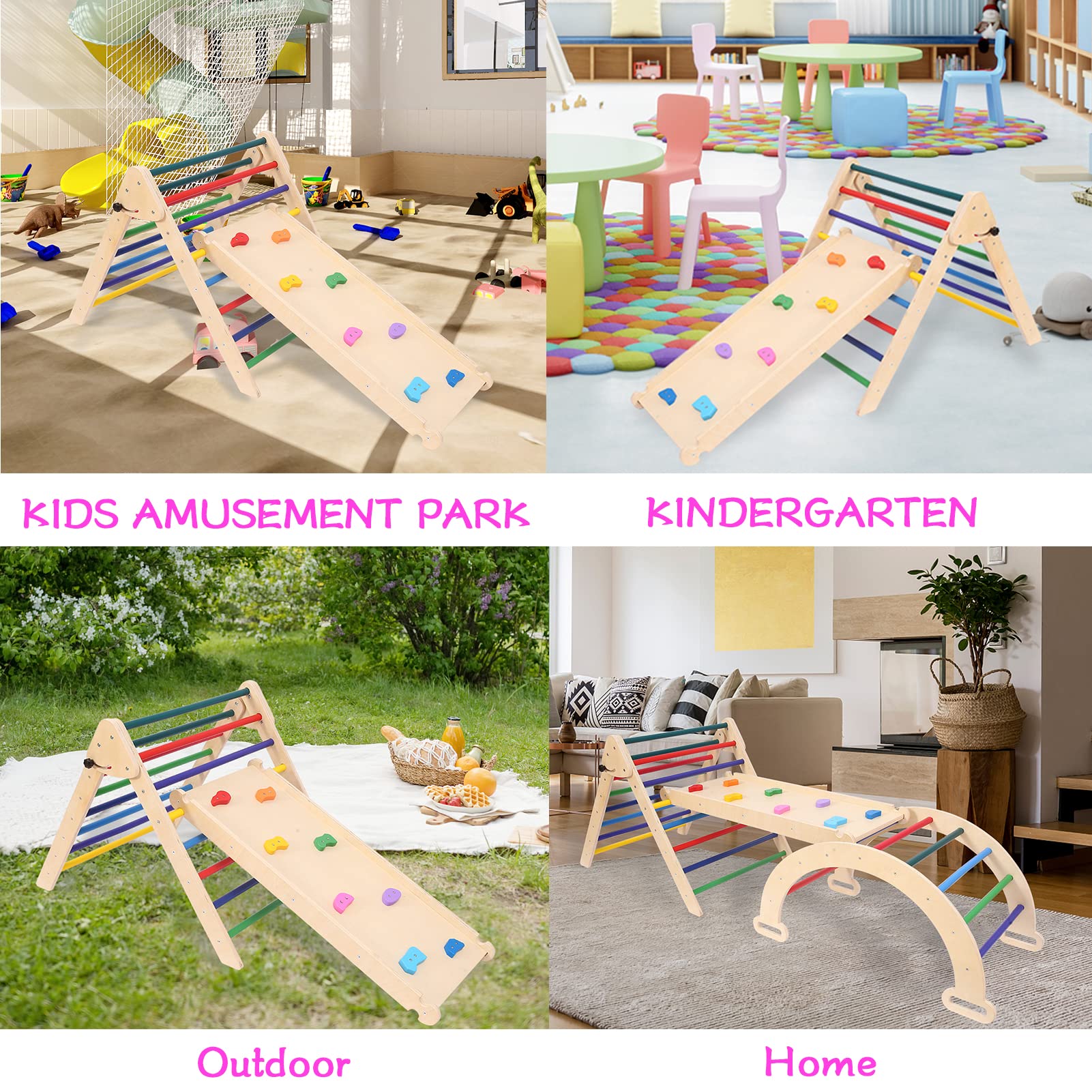 - 4-IN-1 TOY- This Wooden Toddler Climbing Set 4 in 1 includes a triangle climbing ladder, double sided ramp slide and a climbing arch. It is perfect for indoor play, Multiple game modes provide endless fun for your kids.