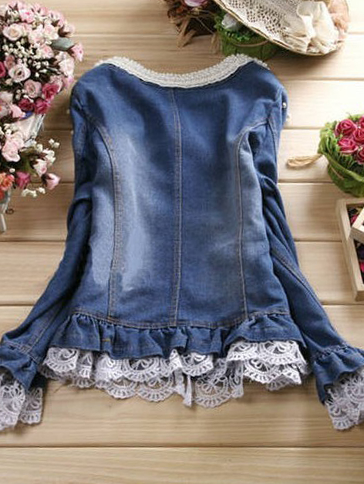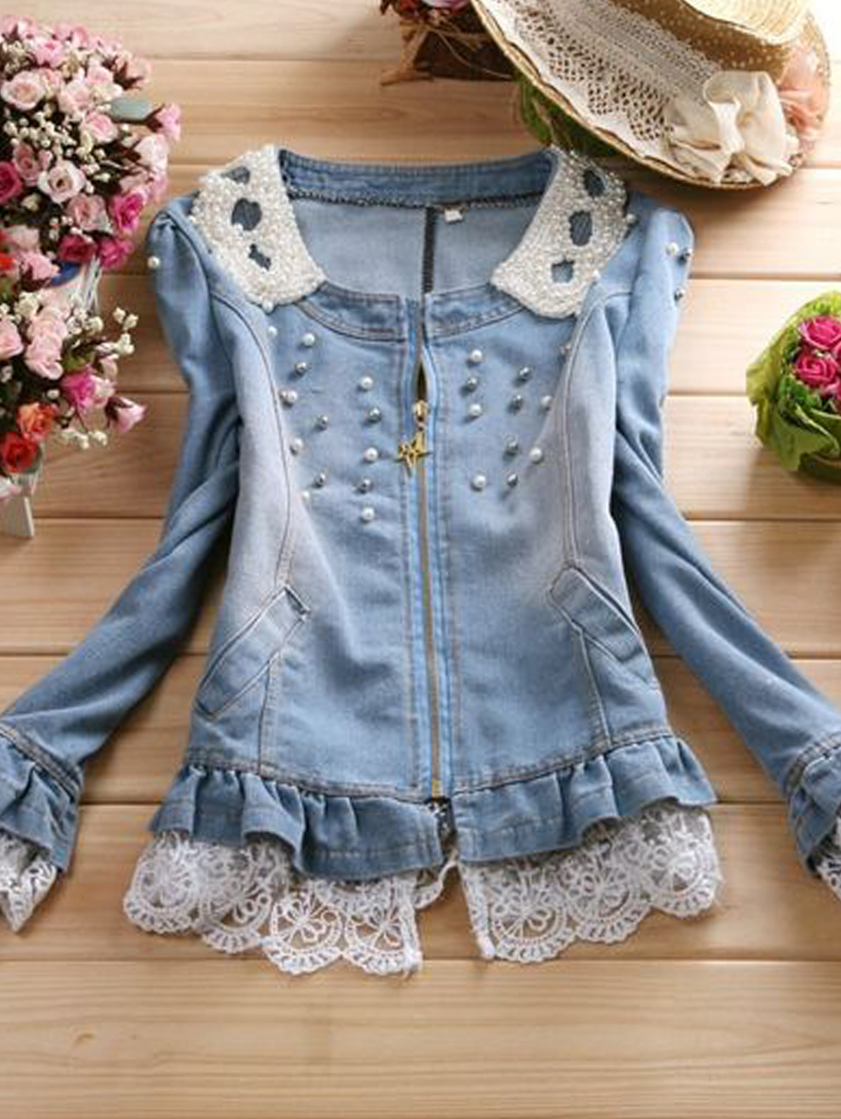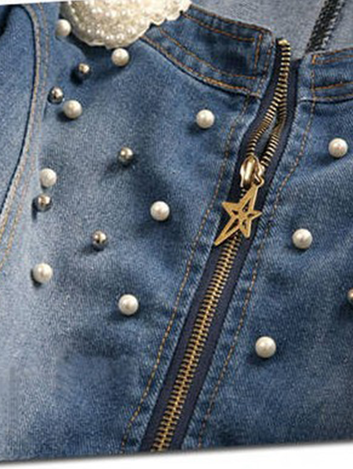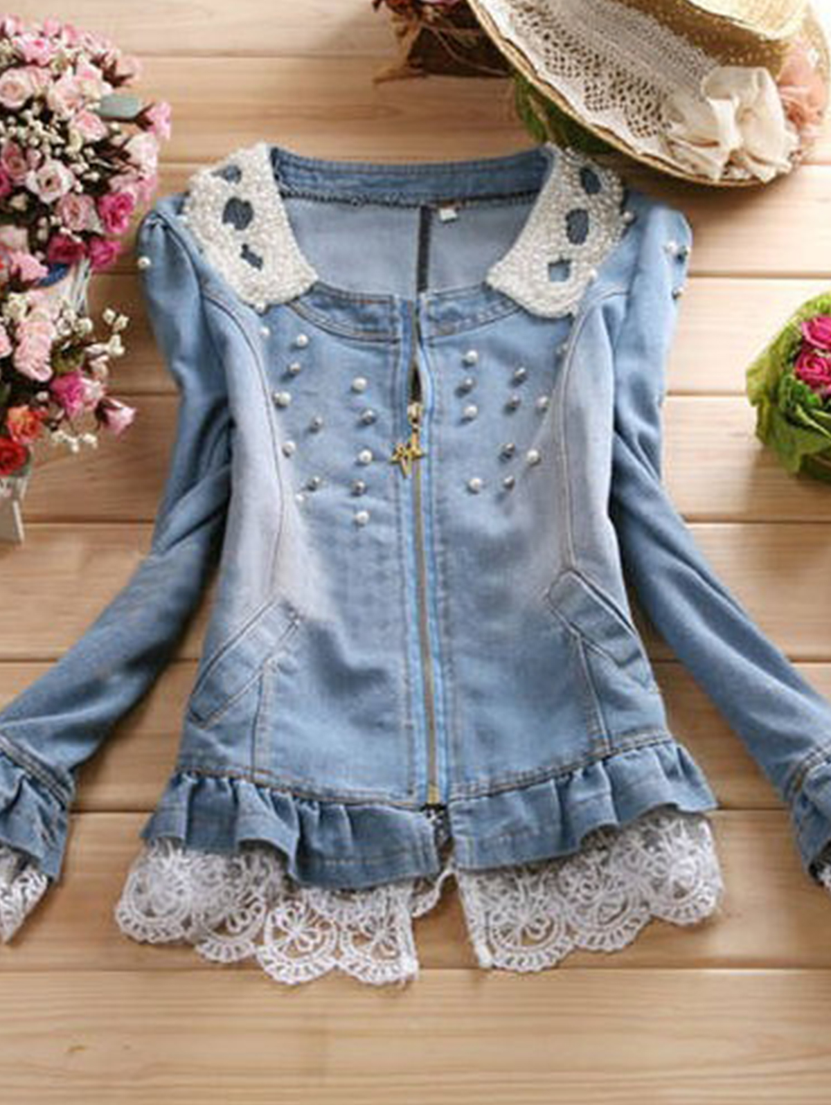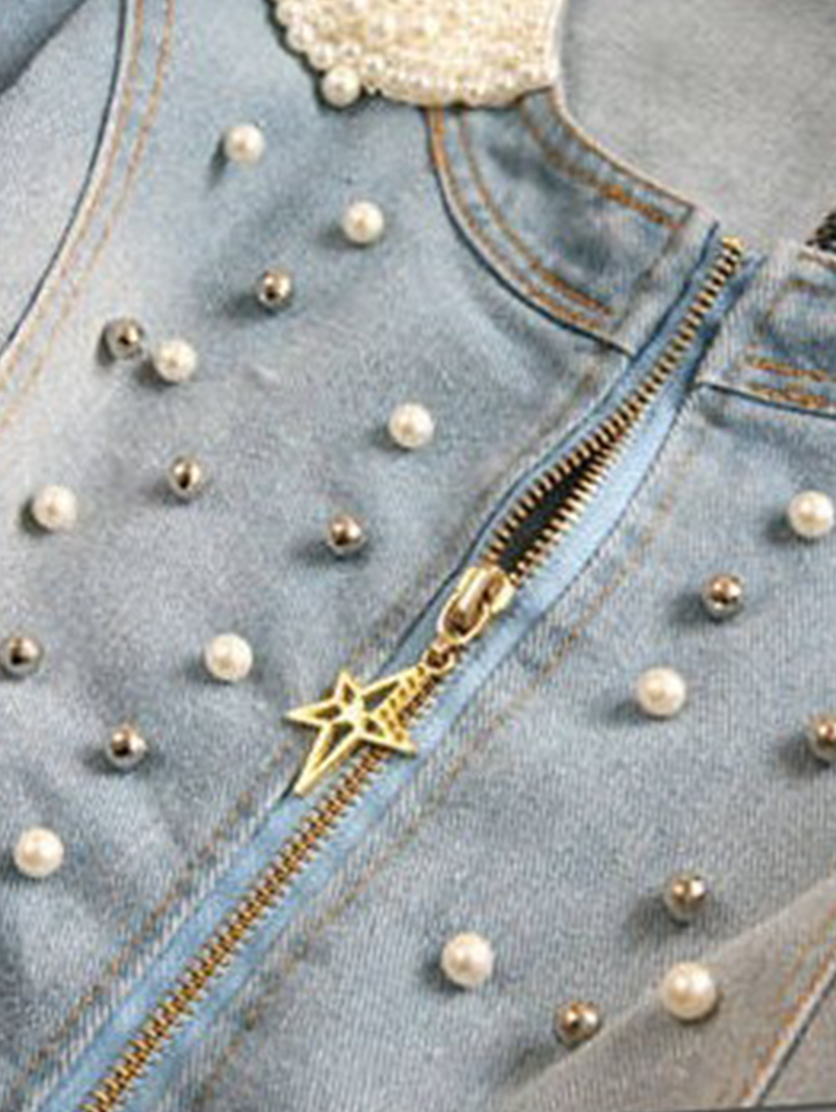 Pearl Decor Zipper Lace Stitching Washed Denim Jacket