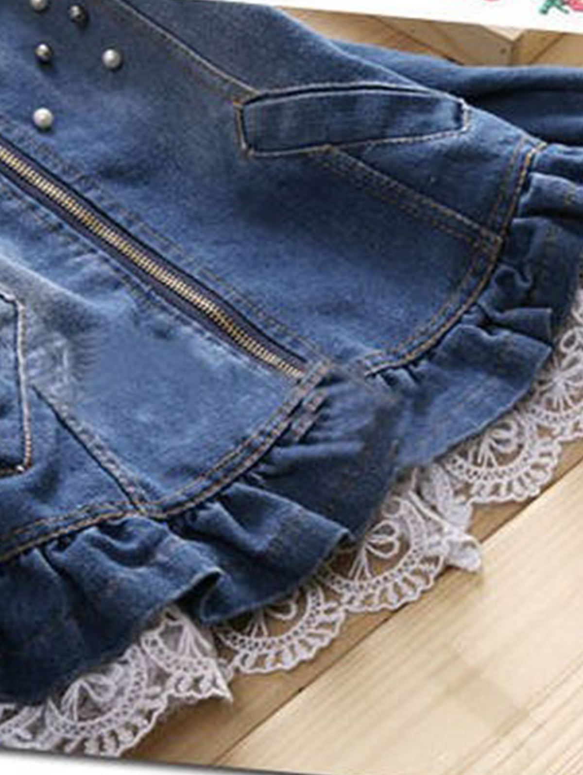 • Pearl Decor Zipper Lace Stitching Washed Denim Jacket