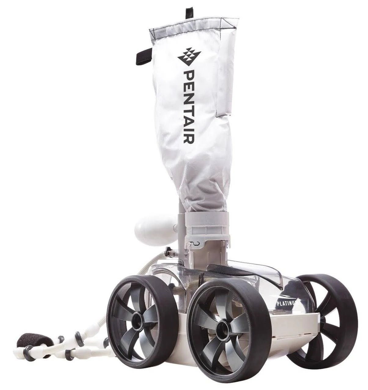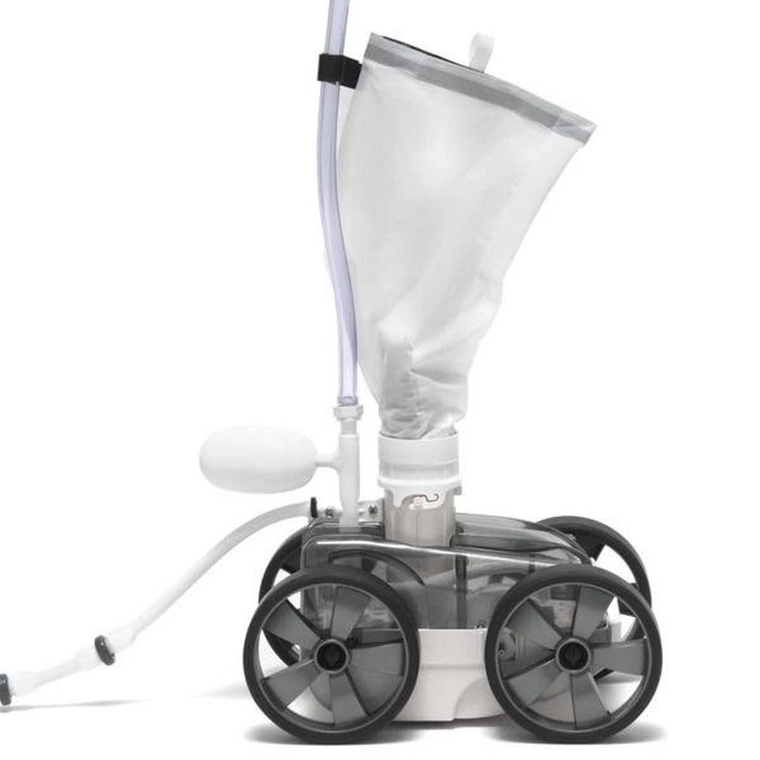 Features. Dual thrust jets provide maximum power for speed and suction so most pools are cleaned in just 1-3 hours. Front-wheel drive and heavily treaded tires provide maximum traction on inclined surfaces to assure total pool wall and floor coverage. Four wheel design prevents tipping (common with 3 wheel cleaners) for uninterrupted and unattended performance. Large-capacity debris channel and huge intake throat easily pick up larger leaves and debris Suitable for concrete vinyl-lined and fiberglass pools. Grey Top White Bottom Cleaner for Lighter Colored Pools. Dimension - 2 L x 0.25 W x 2.25 H in.