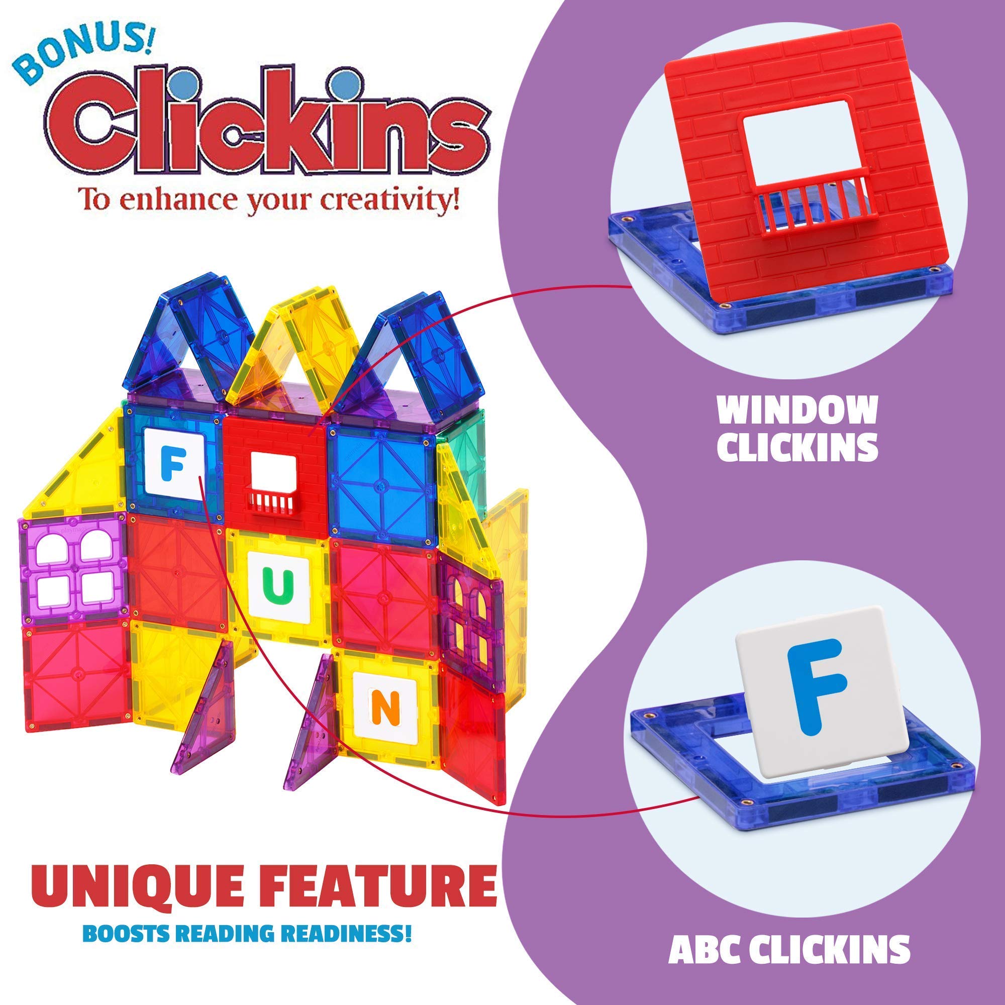 - STRONGER, SMARTER MAGNETIC BLOCKS: Includes 132 Magnetic tiles with Exclusive SUPERMAGS; Strong, Durable Magnets are Great for Building Tall 3D Structures Playmags are the only magnets for kids with SUPERMAGS and Clickins to our name! Super strong magnets guarantee super sturdy structures, while alphabet letters click in to windows to inspire extra creativity!