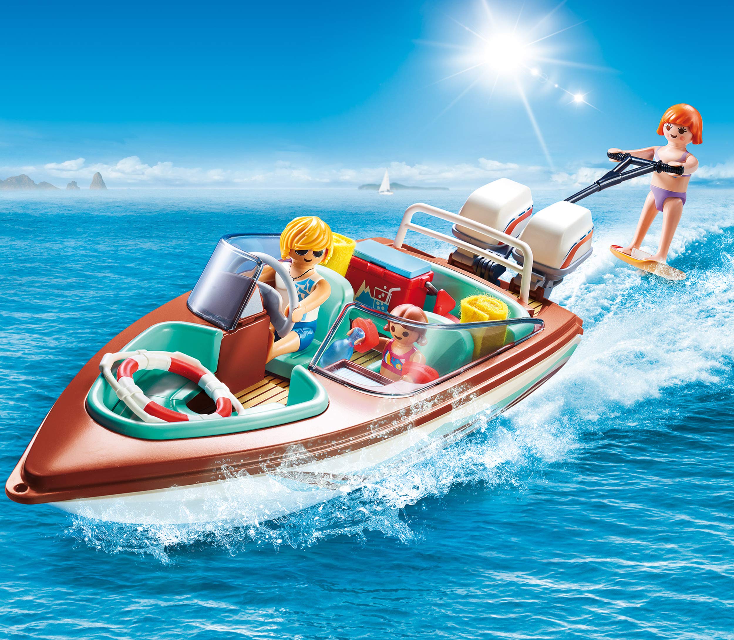 - Set includes two adult figures, one child figure, motorboat, underwater motor, handrail, wakeboard, life ring, towels, cooler, toy Sailboat, and other accessories