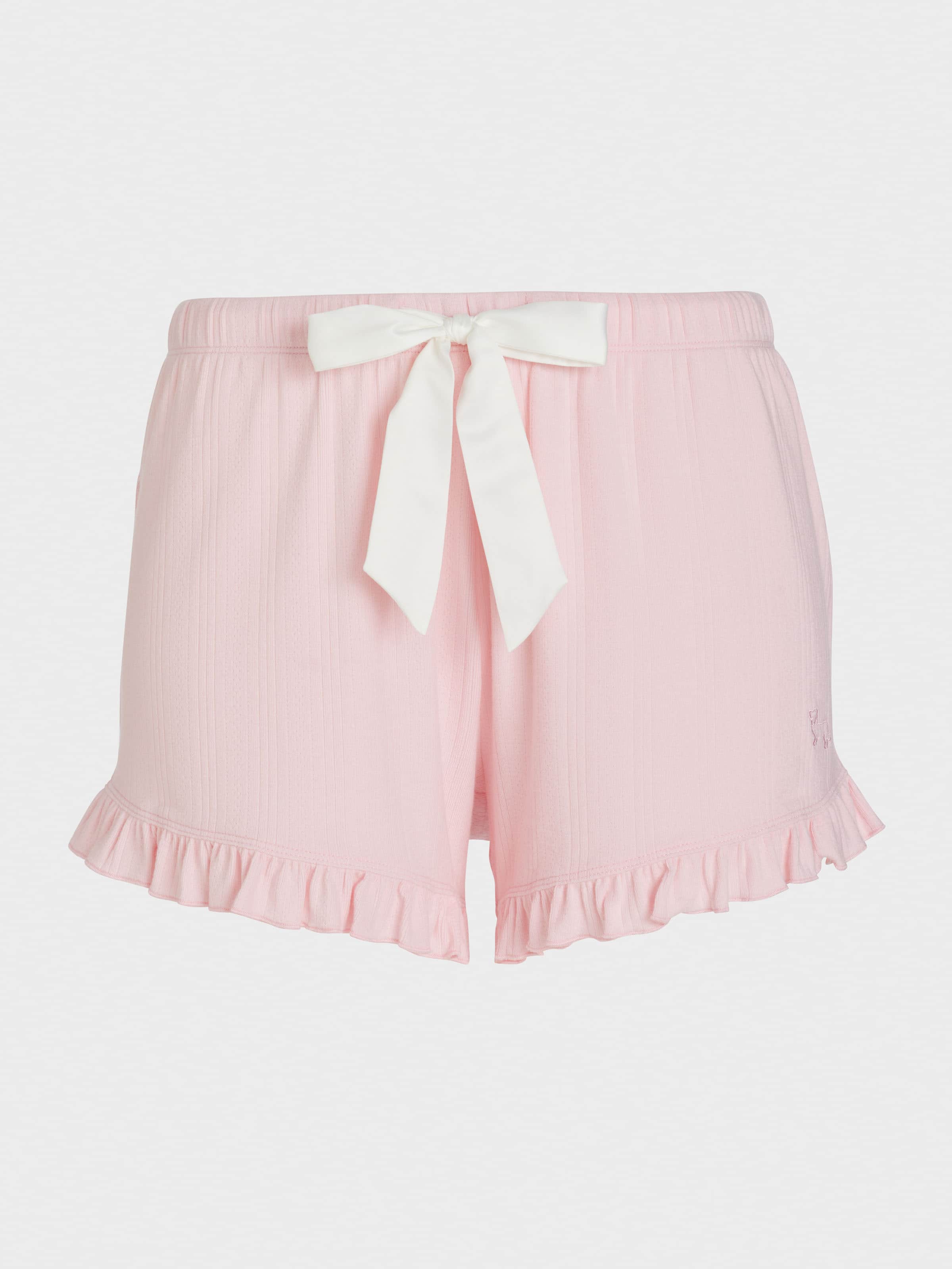 Pink pointelle makes for perfect PJs this summer and beyond. Pair these sweet mini flutter shorts with the matching pointelle tank for a vintage spin on a summer classic.