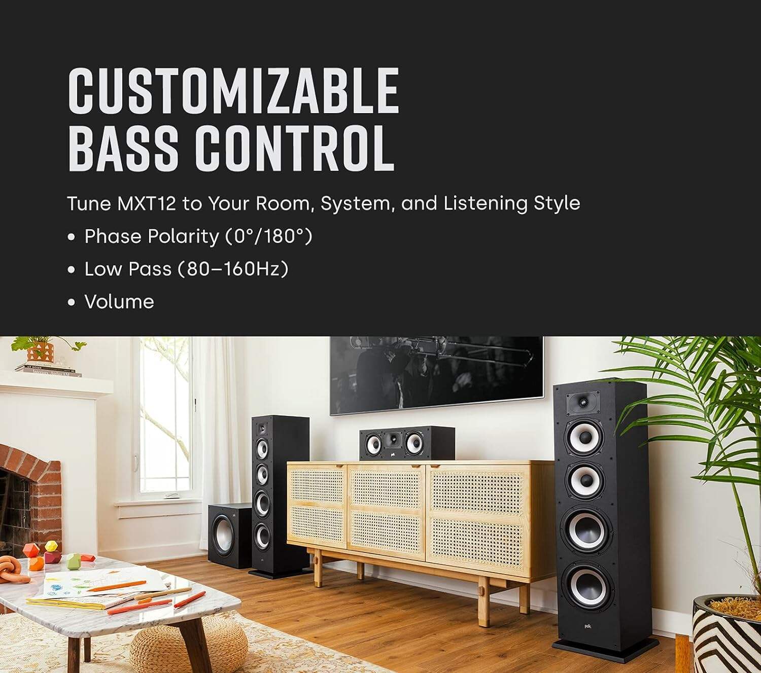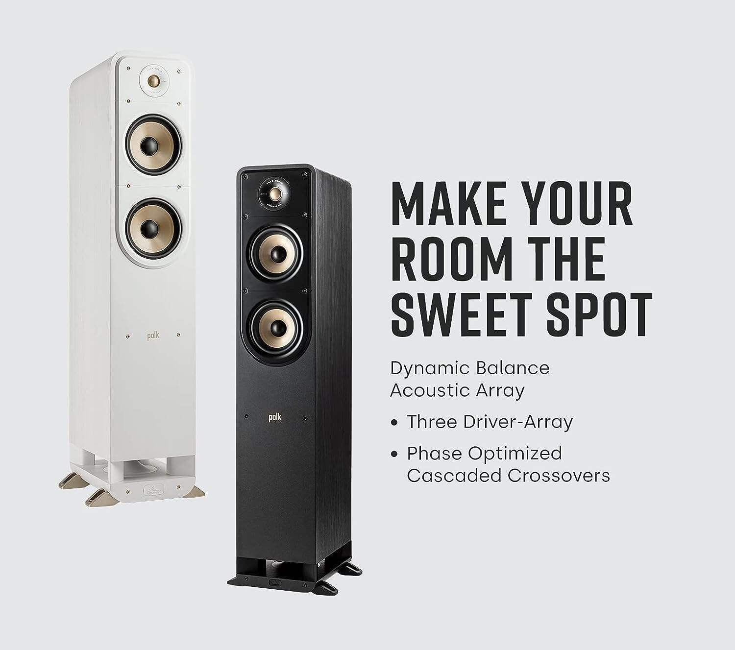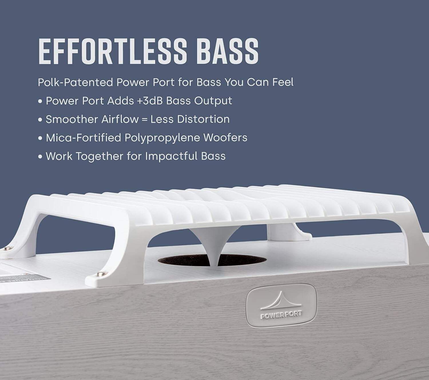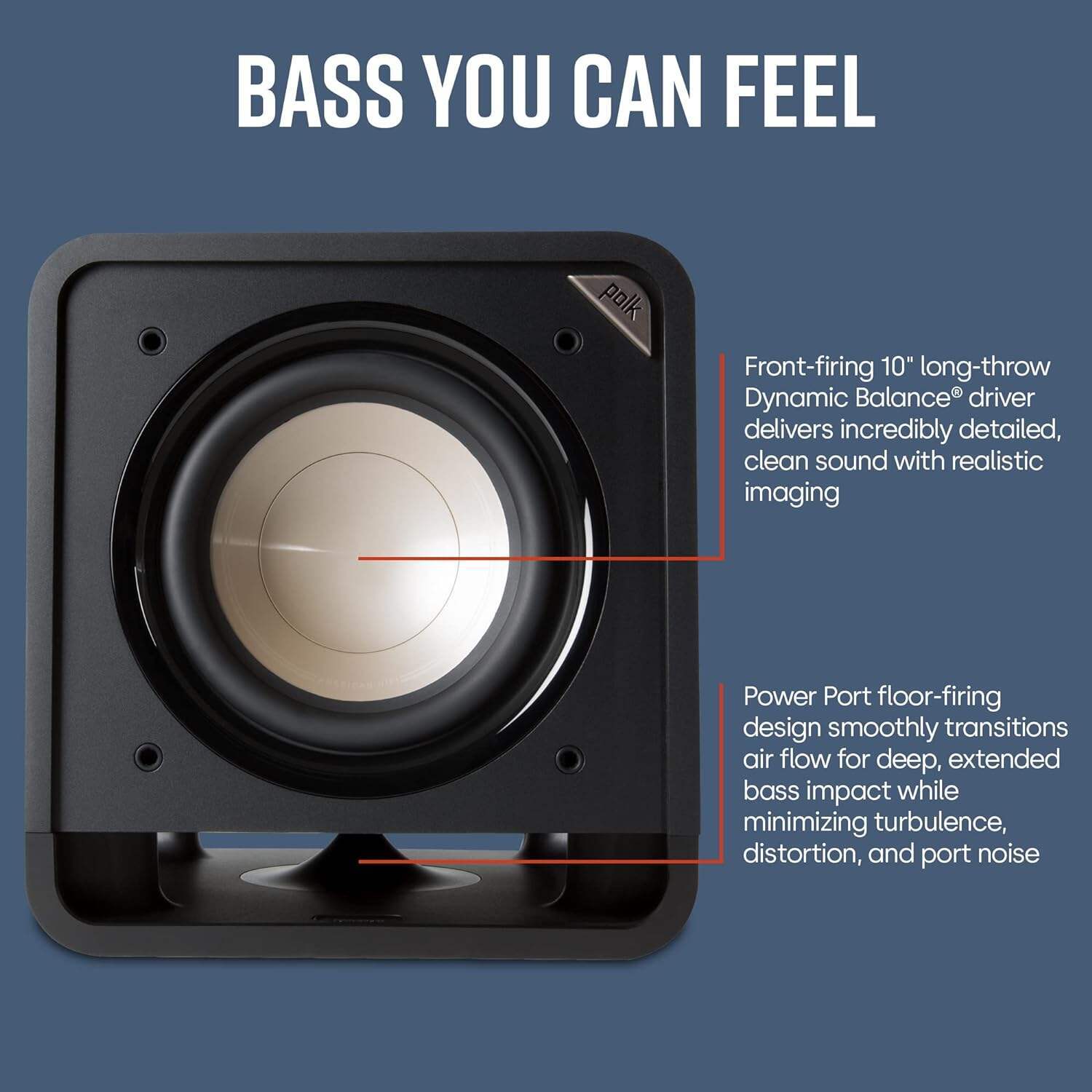 - NOT ONLY HEAR, BUT FEEL THE HEART-THUMPING BASS - Polk's Patented Power Port Technology delivers 3dB louder bass output than conventional ported speakers, minimizing turbulence & distortion so you do not miss any detail in your movies, music, and games