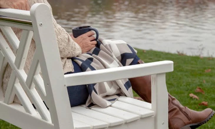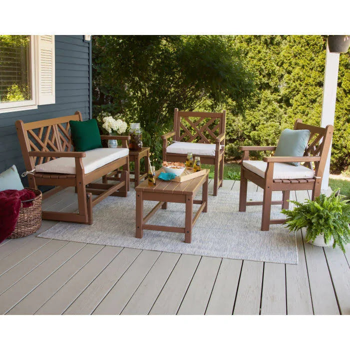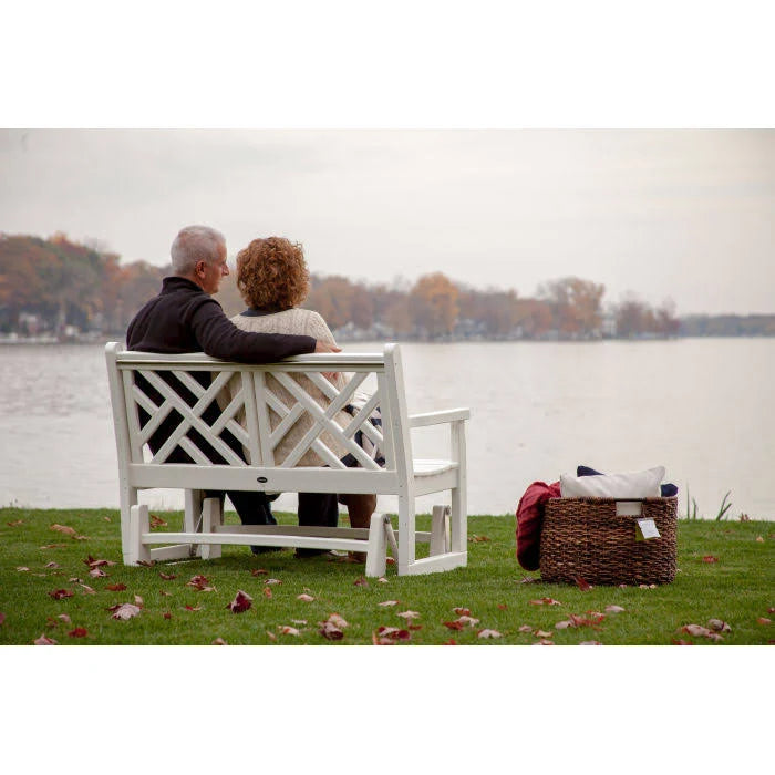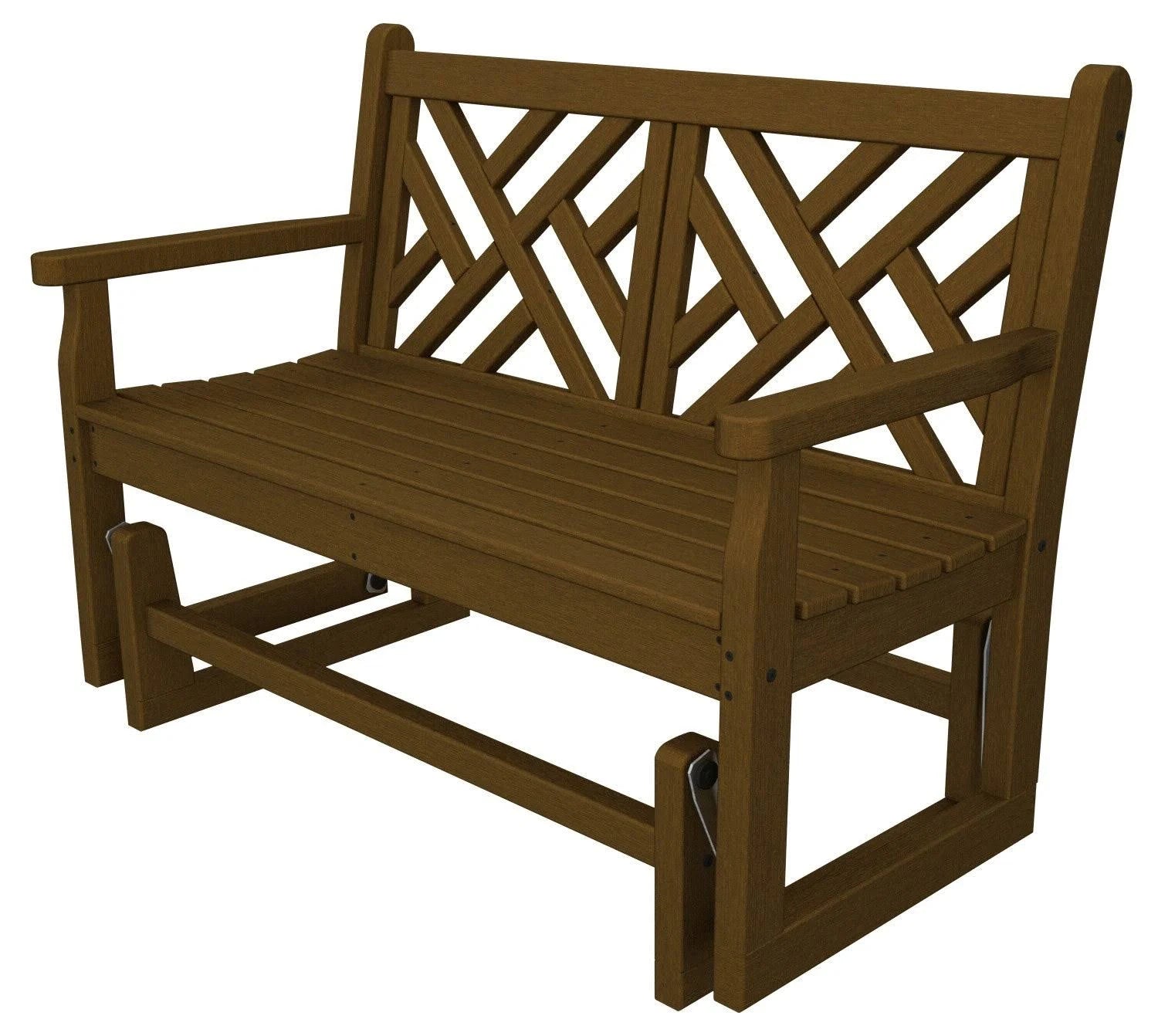 Whether it's under a canopy, by the pool, or on the front porch, the POLYWOOD Chippendale Recycled Plastic Outdoor Glider Loveseat fits in beautifully with its classic style. This glider is made from eco-friendly recycled plastic in a variety of colors to suit your needs. The Chippendale Collection centers on fine, intricate details, like the attractive geometric weave on the back and the stainless steel hardware. The experienced performance of this collection is sure to add a personalized touch to your outdoor environment. No assembly required. Weight: 79 pounds. Dimensions: 47.5L x 24.25W x 34H inches.
