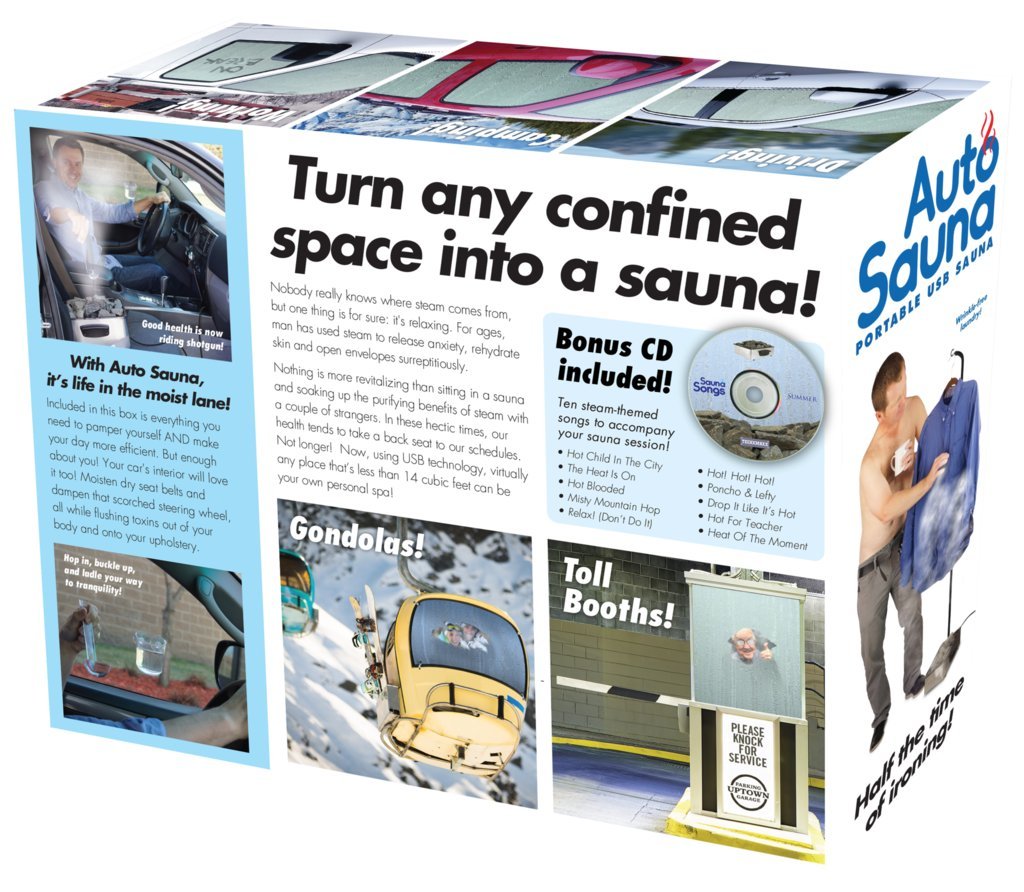 - PRANK GIFT BOXES at first appear to contain bizarre products from ridiculous companies. Simply, u201cPut Your Real Present Inside the Joke Box" and try to keep a straight face as you watch your friends & loved ones attempt to remain gracious while thanking you for the present. Then watch them explode with laughter when they discover their actual stuff inside and realize theyu2019ve been pranked. (DOES NOT INCLUDE ACTUAL AUTO SAUNA)