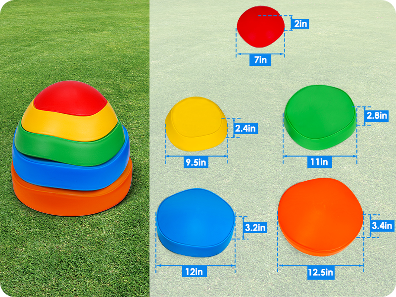 - u3010UNIQUE DESIGNu3011There are five different colors and sizes of stepping stones to meet the needs of children at different stages of development.Colorful colors can help kids promote their color cognition ability.Five sizes can be arranged and combined into different difficult paths.As an obstacle course, kids can walk, stand, jump or climb stepping stones to exercise balance and coordination.