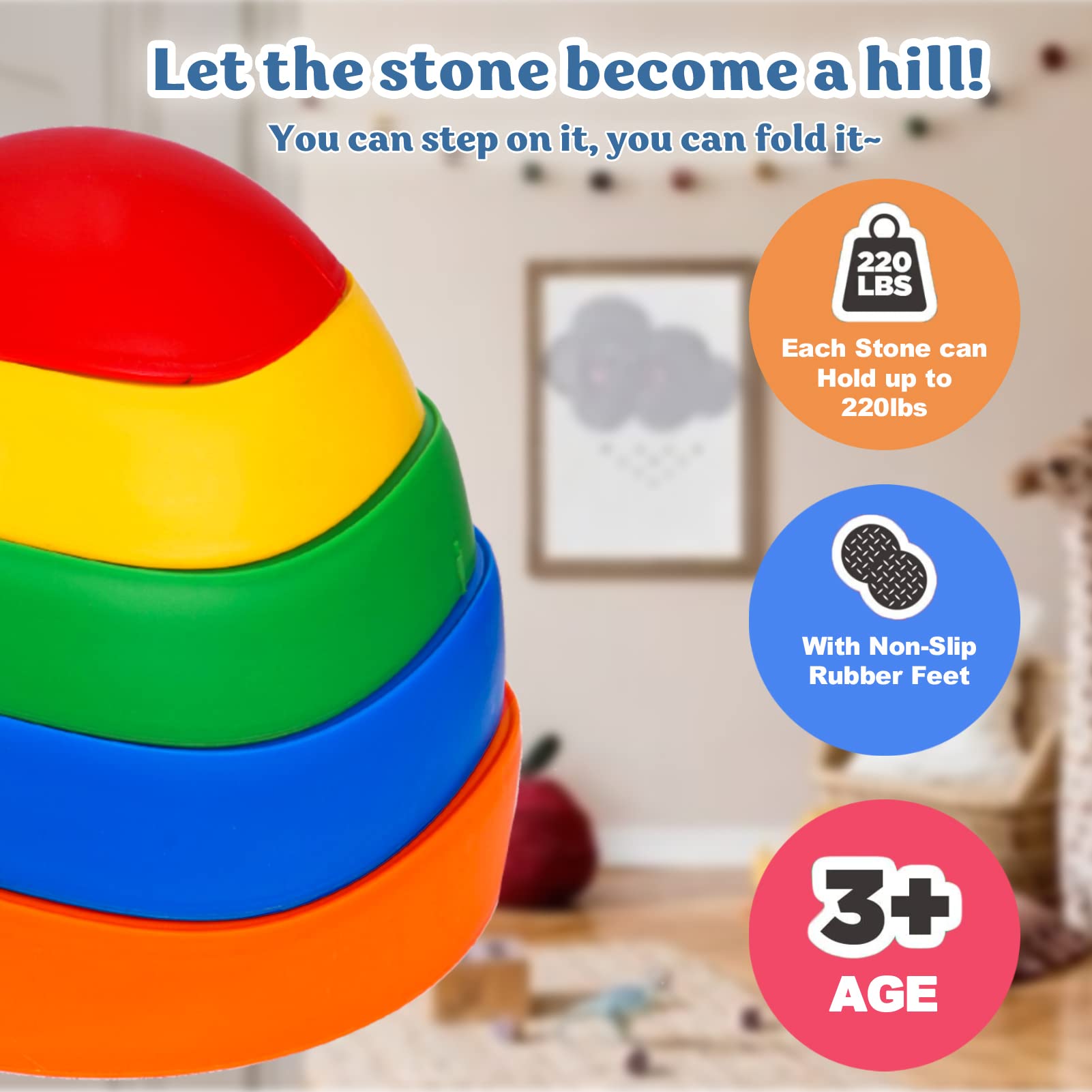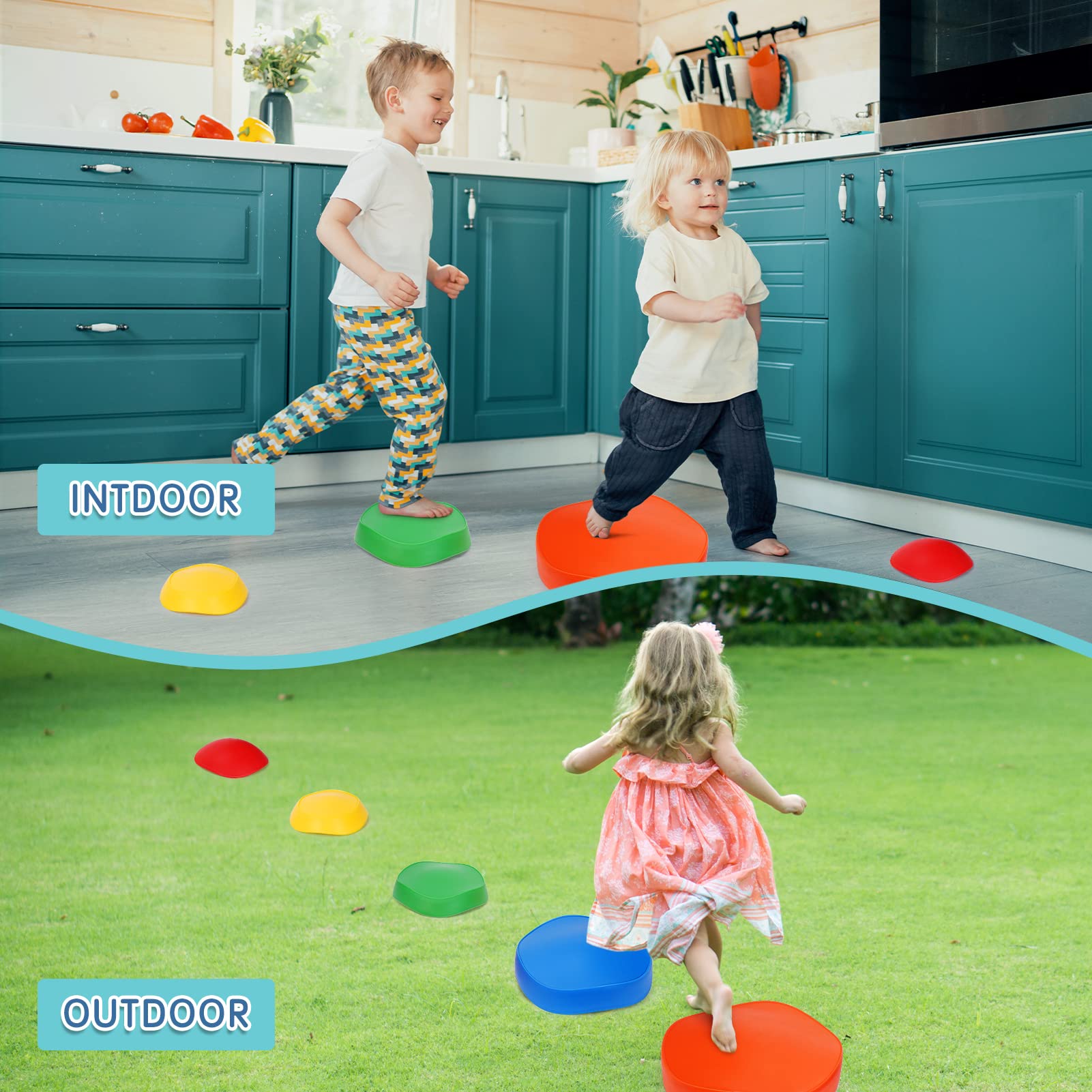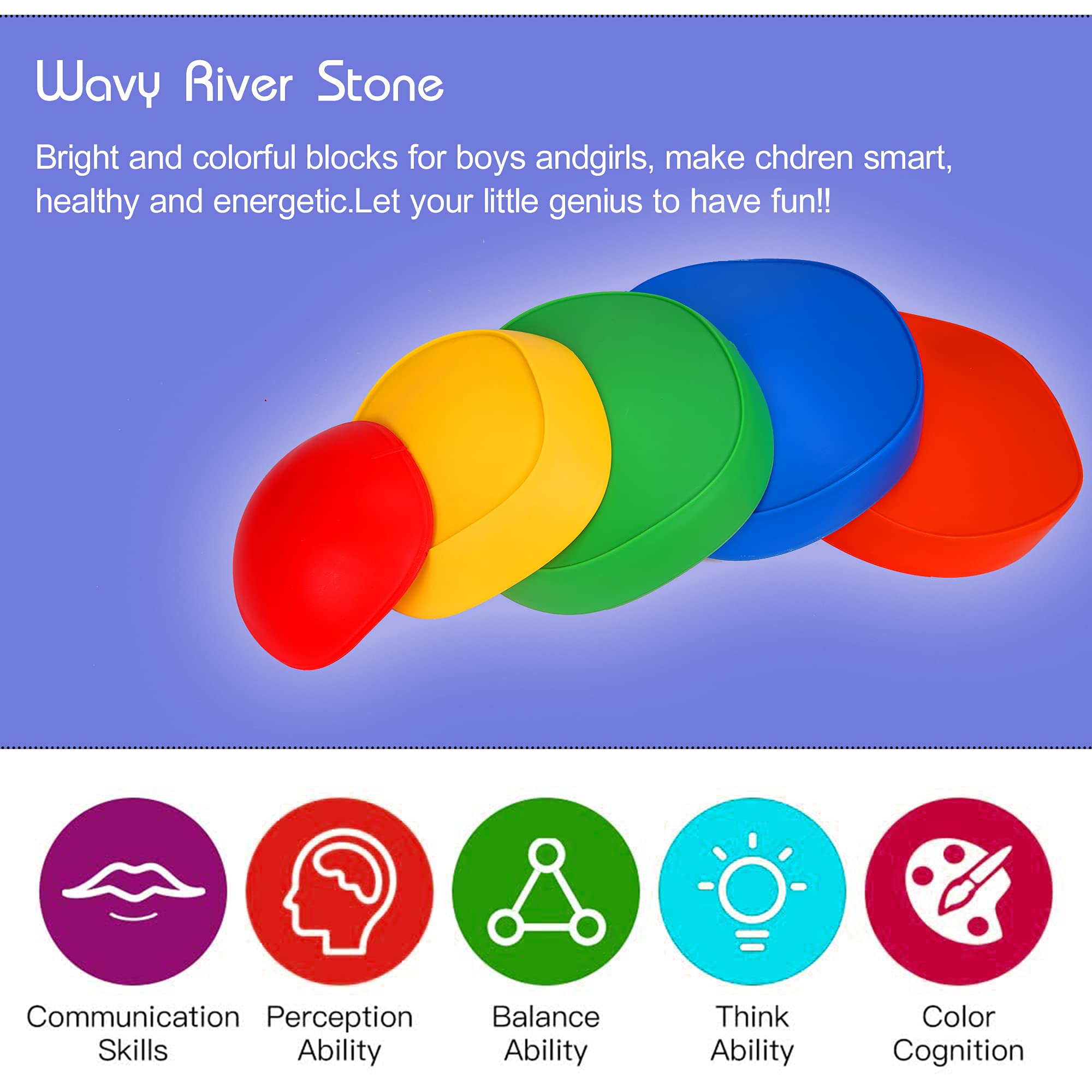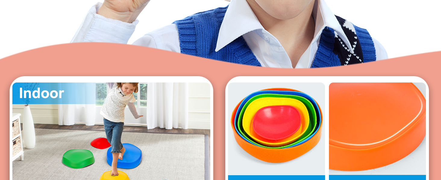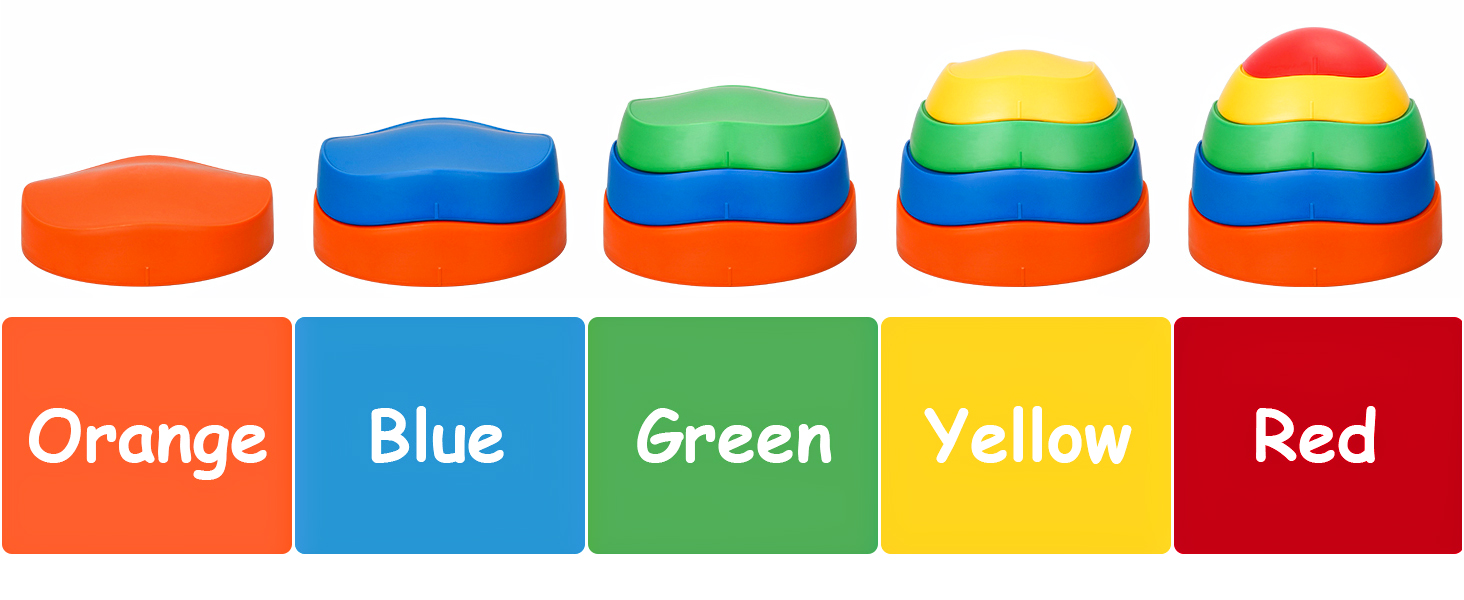 - u3010UNIQUE DESIGNu3011There are five different colors and sizes of stepping stones to meet the needs of children at different stages of development.Colorful colors can help kids promote their color cognition ability.Five sizes can be arranged and combined into different difficult paths.As an obstacle course, kids can walk, stand, jump or climb stepping stones to exercise balance and coordination.