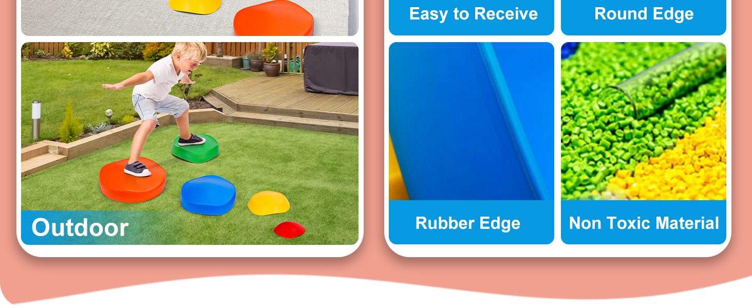 - u3010QUALITY & SAFETYu3011Kids stepping stones are made of heavy duty plastic and silica gel pack edge. Polyurethane in the material have been tested by international safety inspection agencies, no harm to the child's skin. Each balance stone has a non-slip silicone edge to reduce slipping or accidents. The stepping stone max load is 220lbs, also suitable for adults, so it is an excellent outdoor toy for kids.