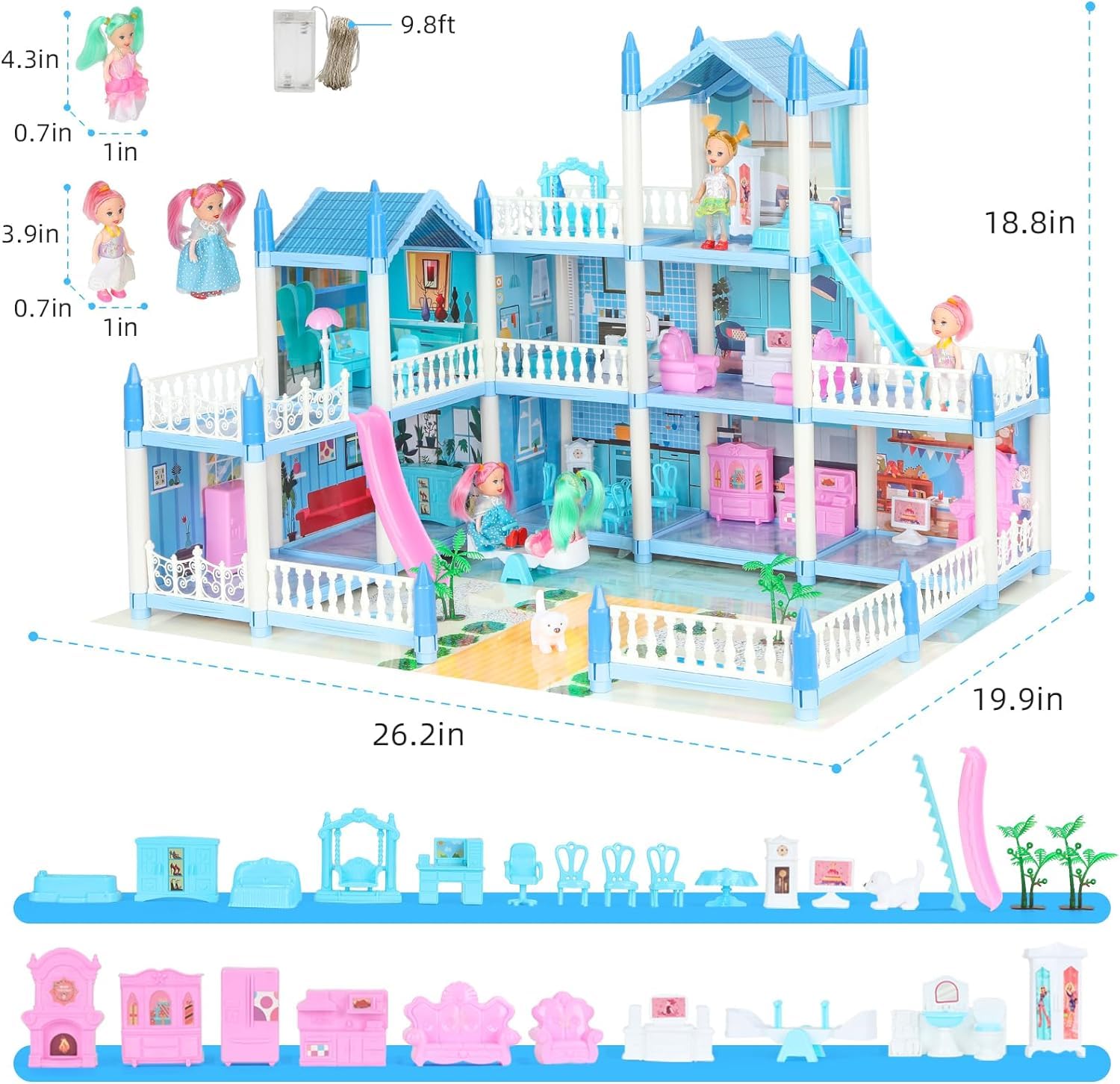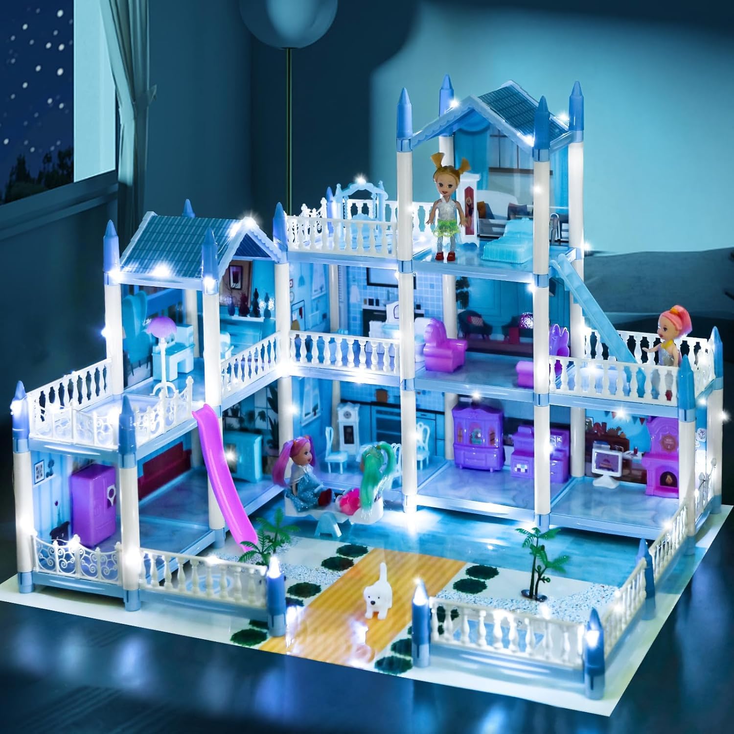 - u3010Much More Funu3011 -u00a0This blue doll house 7-8 has an open layout so several kids can play together. Not only girls, but also suited for our little boys to joy in, child have their own building dream. A perfect role-play party toy for kids. With colorful LED light strings, the dollhouse looks more dreamy at night.