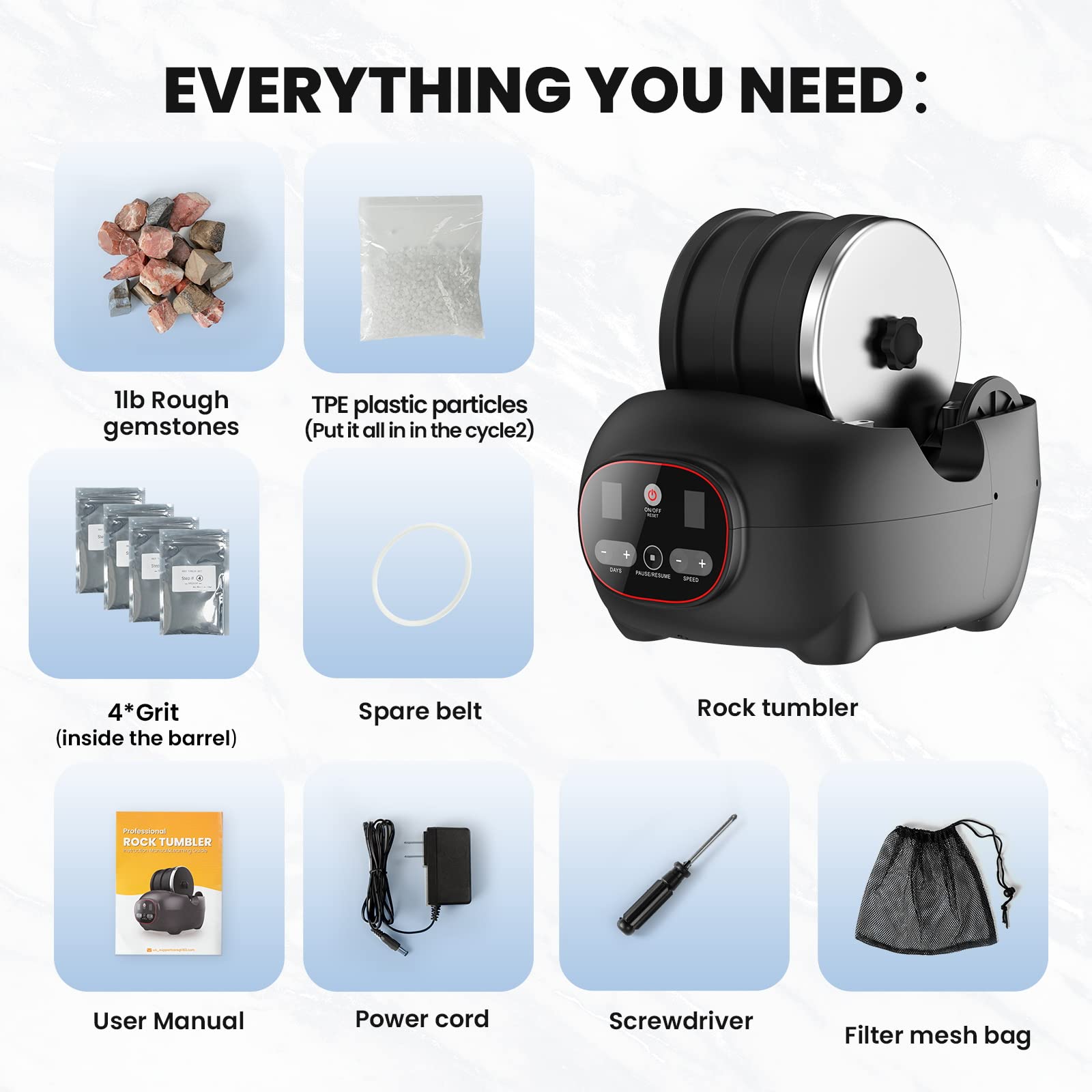 - u2764 {ALL-IN-ONE ROCK TUMBLER } - You will get rock tumbler, four polishing grits, 1lb of rough gemstones (tiger eye and jasper), reusable TPE plastic pellets, replacement ultra durable belt, a power cord, a screwdriver and a filter bag and a useru2019s manual. Discover and learn the fun process of rock tumbling with this professional rock tumbler. If your experience is less than stellar, let us know and we'll make it right for you!
