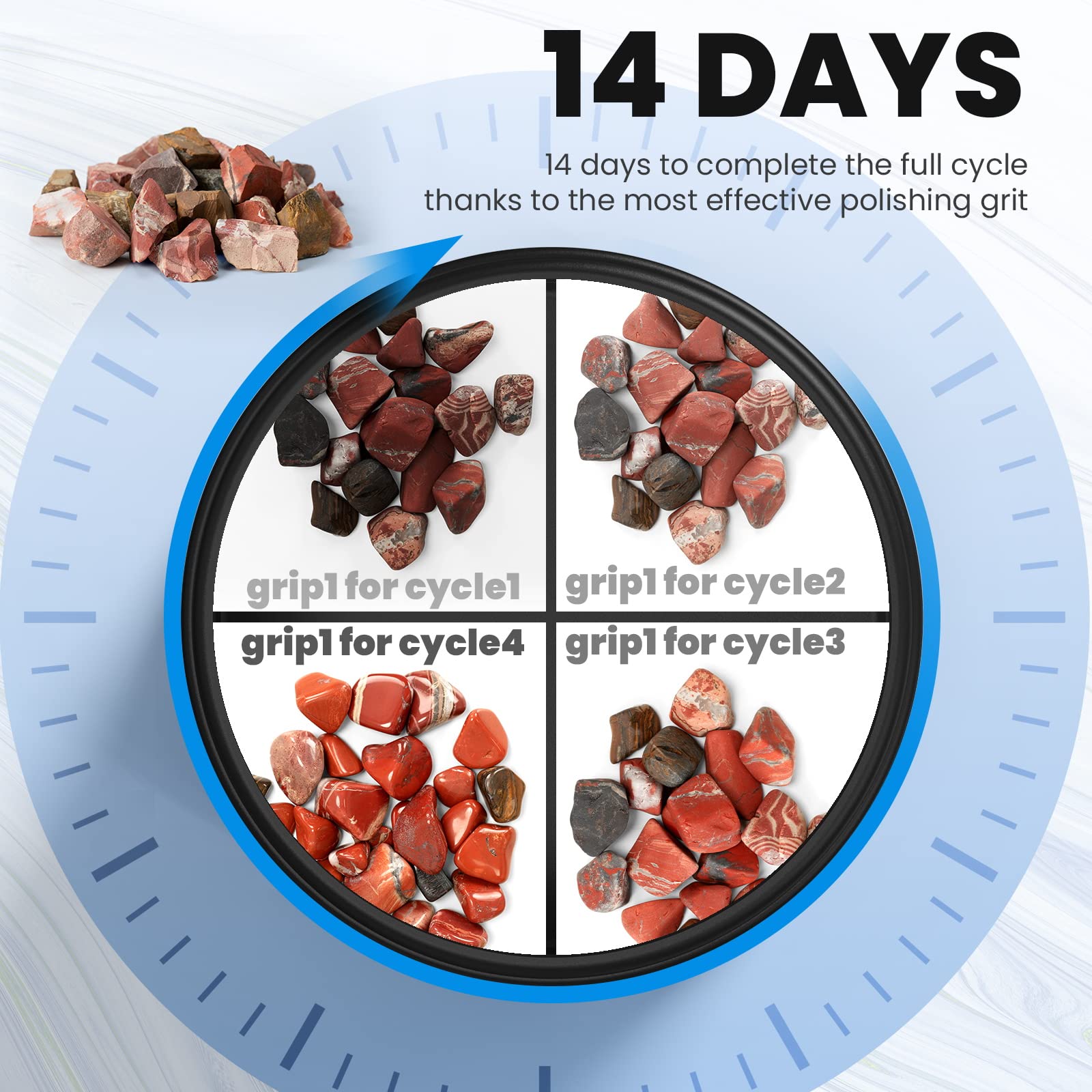 - u2764 {14 DAYS ENTIRE CYCLE } - (Our Stones)After thousands of tests in different density grip on all polishing cycles, we have configured the most effective polishing grit for each cycle through rigorous testing to create dazzling polishing results within 14 days (The entire cycle is 16 days shorter than other machines.)