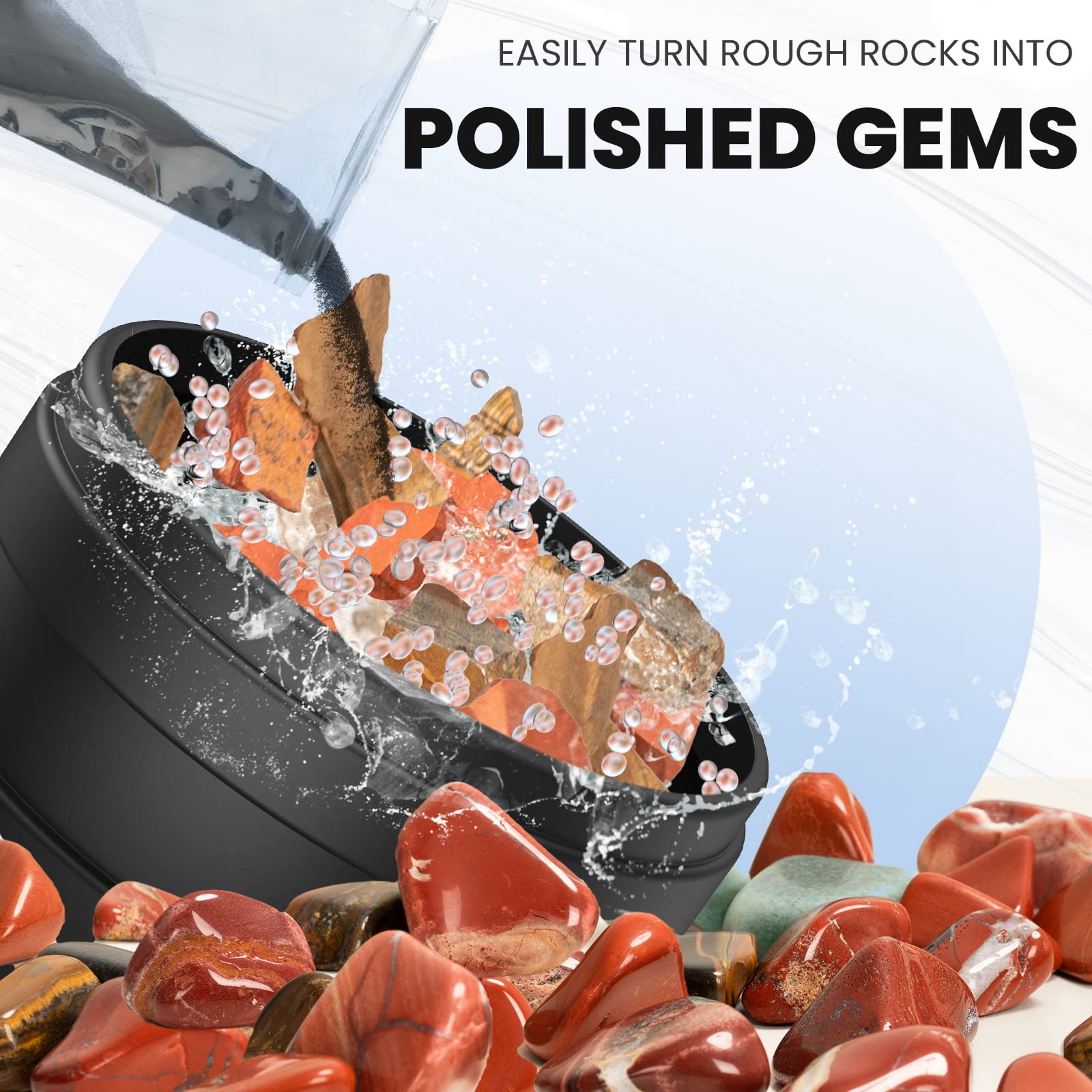 - u2764 {TURN ROUGH ROCKS INTO GEMSTONES} -This rock polisher kit comes with our exclusive reusable TPE plastic Particles Our TPE plastic Particles play a vital role by filling the gaps between the stones in the tumbler. This not only increases the source of friction that the stones undergo, but also acts as a cushion to prevent the gemstones from hitting each other, Add them in the 2nd through 4th cycle for reduced rock breakage and an incredible shine.