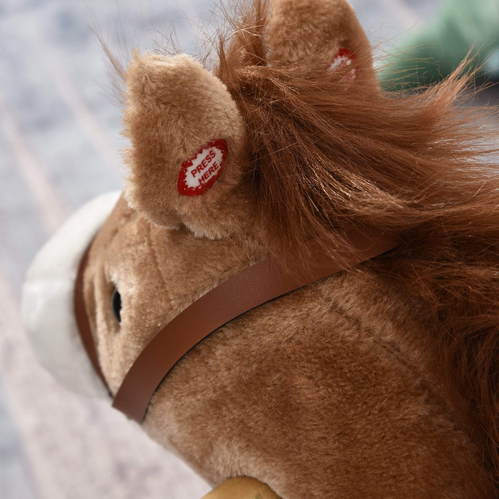 - Interactive Toy: This baby rocking horse features a moving mouth, wagging tail and plays neighing and galloping sounds with a press of the ear button.