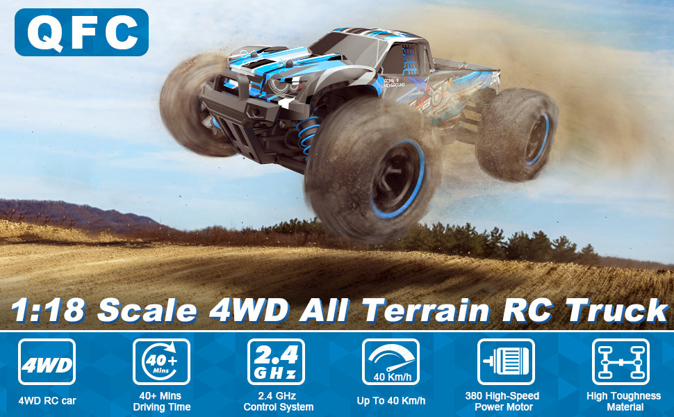 - 1:18 Scale High Speed RC Car: This 4WD high-speed remote control car with its 380 high-speed motor can reach speeds of 25 mph. The caru2019s 4-wheel drive, powerful motor and high traction tires can handle any surface and grade. The remote control comes with a speed level setting knob you can adjust for different types of runs.