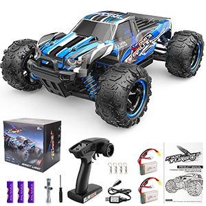 - Long Battery Life, All Terrain: This rc truck comes with two high quality rechargeable batteries which can provide about 40 or more mins of fun filled driving time. The rc cars for adults and kids can climb all types of terrain: grass, gravel road, beach, hills and whatever you can find to put it up against. It can not only handle small jumps with ease, but can also do wheelies and with the right terrain can even do flips.