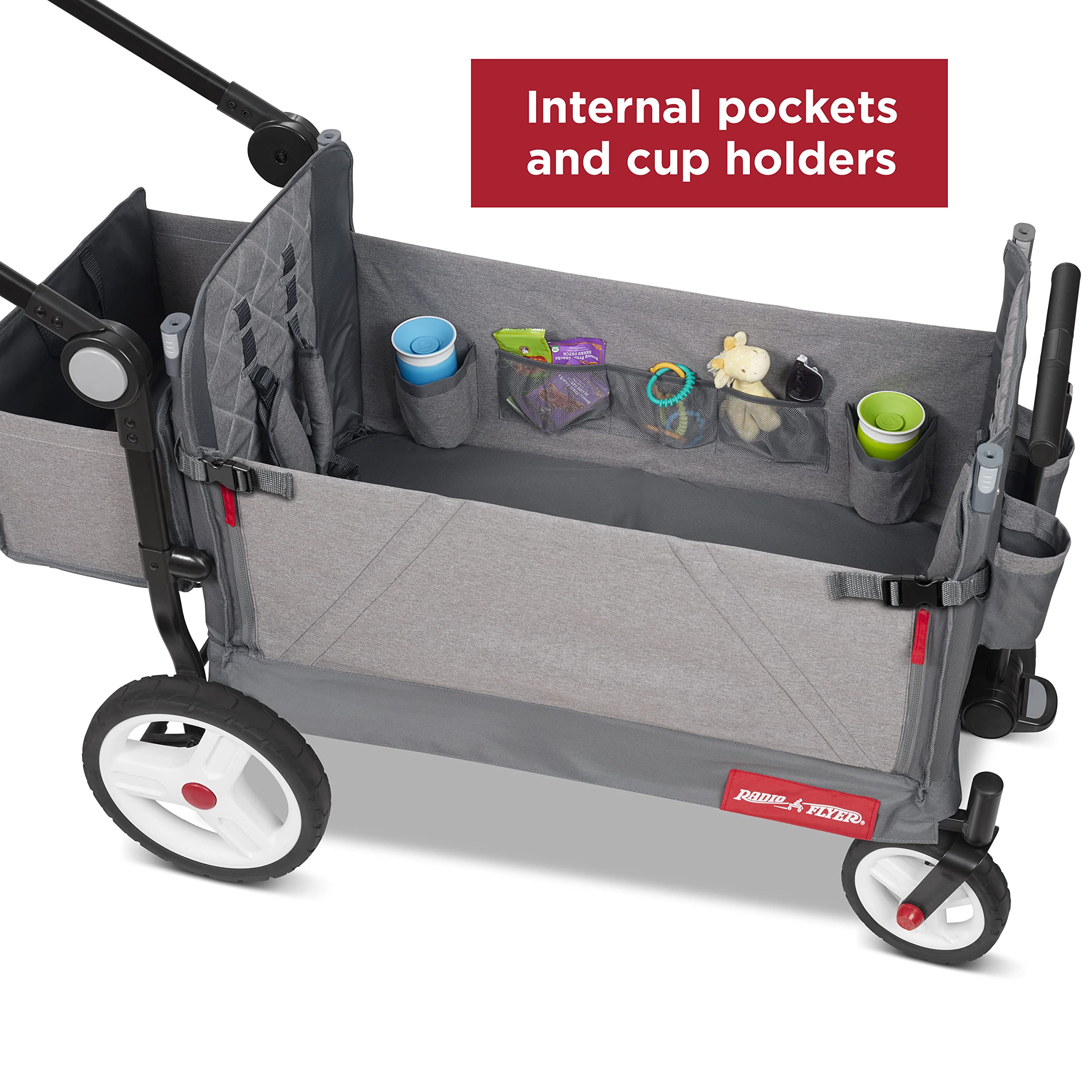 - SAFE FOR KIDS: Radio Flyer wagons pass the ASTM-f963-13 toy safety standard. This wagon includes a rear foot brake, 5-point safety harnesses and a UV protection canopy to protect your baby from the sun.