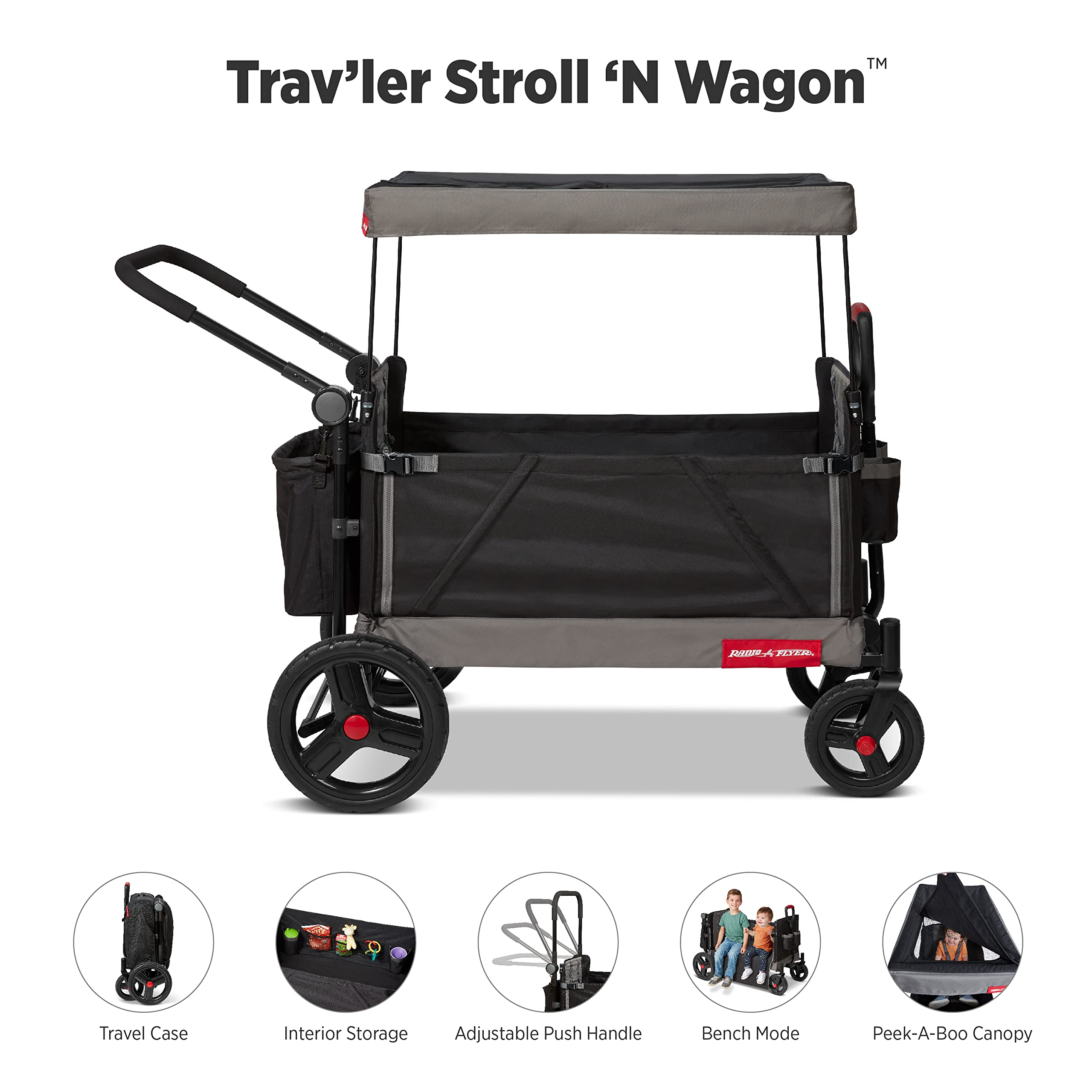 - FEATURES FOR THE WHOLE FAMILY: Included with the Trav-ler Stroll u2018N Wagon are cupholders, a removable rear storage bag, and a peek-a-boo mesh window on the UV protection canopy, making this the ideal vehicle for your whole family.