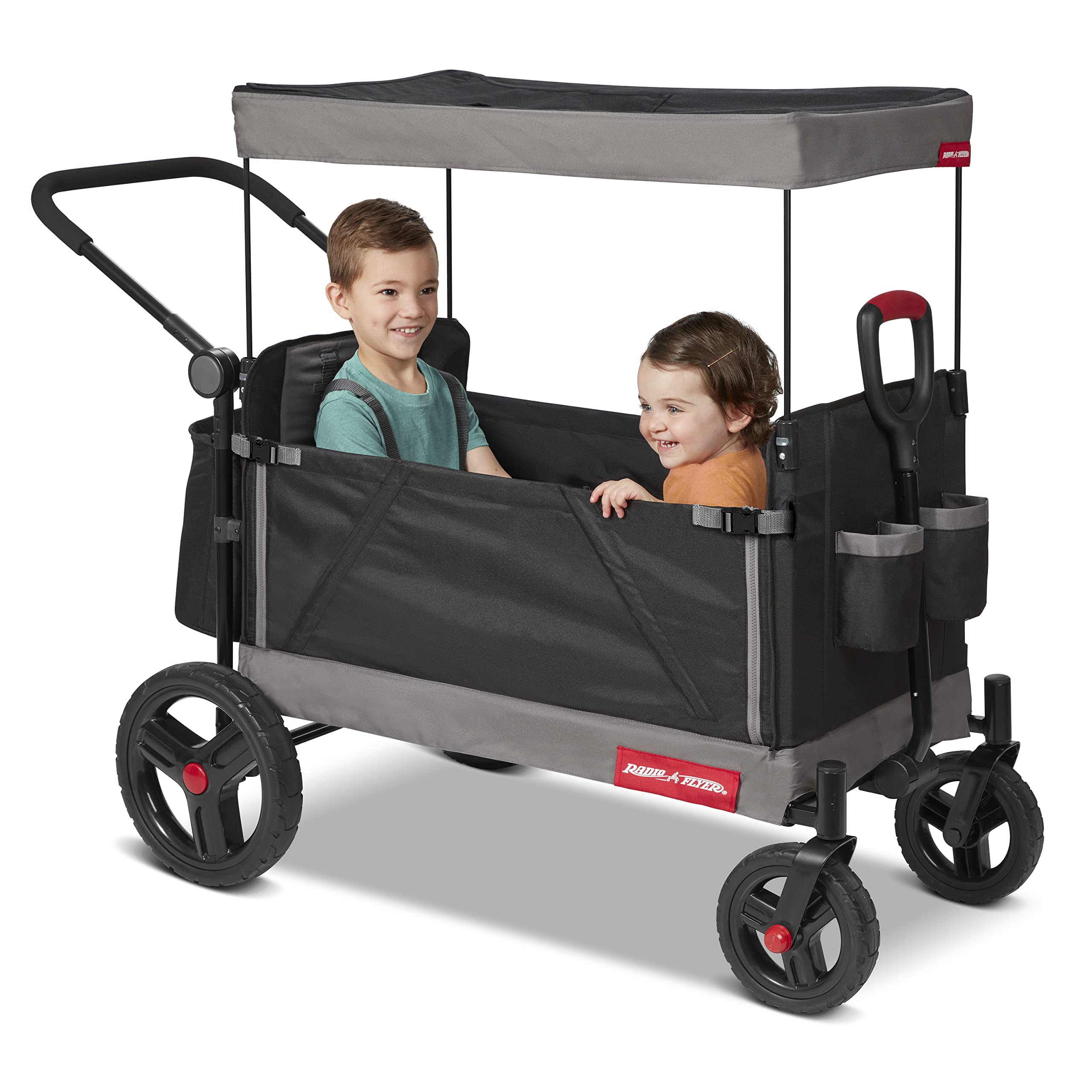 - SAFE FOR KIDS: Radio Flyer Stroll Nu2019 Wagons pass the ASTM-f963-13 toy safety standard. This wagon includes a rear foot brake, 5-point safety harnesses and a UV protection canopy to protect your little ones from the sun.