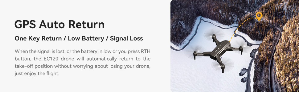 - GPS Auto Return: EC120 is a GPS Drone which ensure it has the high precision flying and RTH feature. It is a safety guarantee as it will bring youru00a0droneu00a0back to take-off point wherever you press the RTH button, or when the drone in low battery, signal-lost condition, you shall never lose your drone. (GPS mode must work in outdoors)