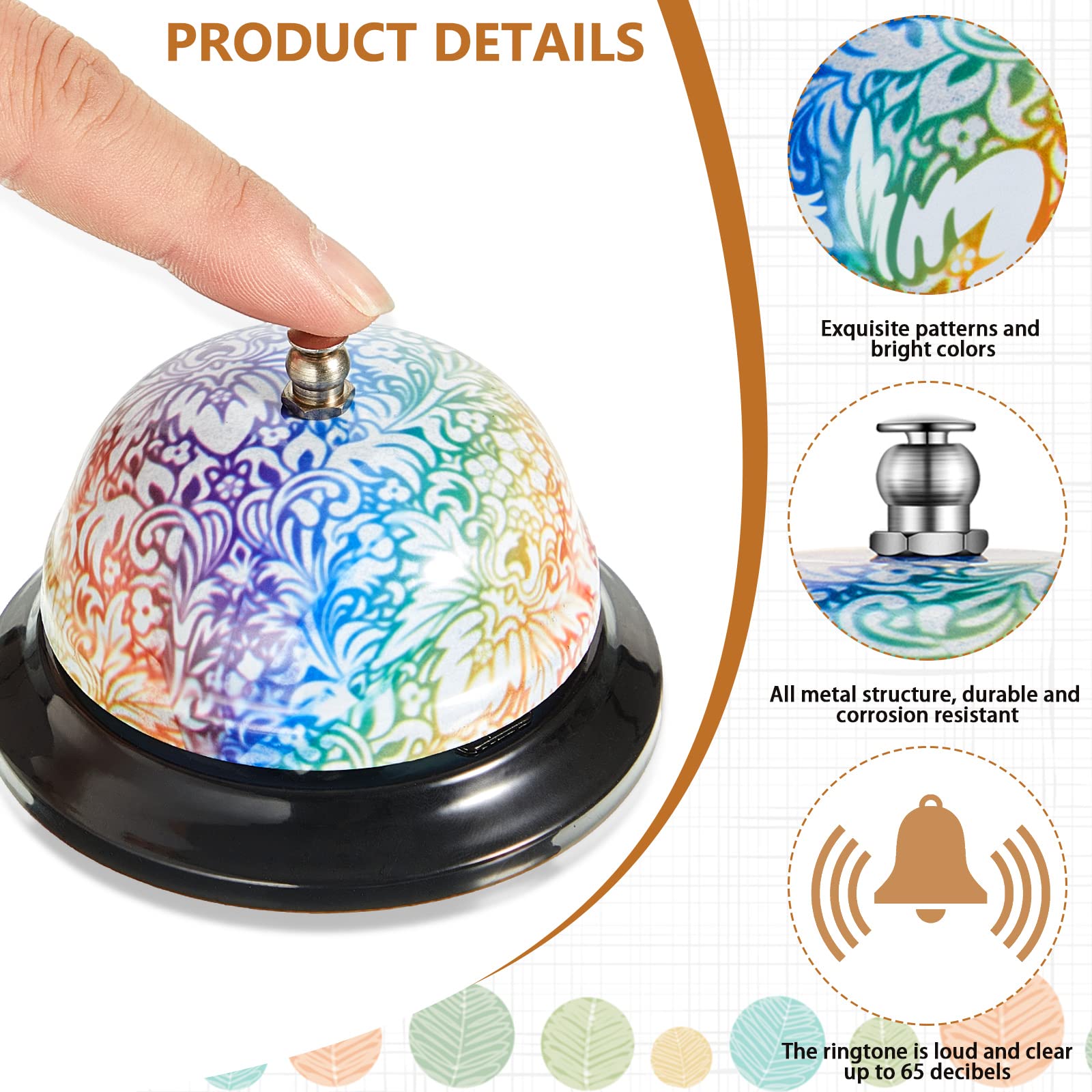 - Package quantity: the package comes with 2 pieces of cute service bells for desk, each measuring 8.5 X 6 cm/ 3.34 x 2.36 inches, weighing 90g/ 3.17 ounces; These desk top bells are printed with vivid and beautiful floral patterns, full of attractive retro style