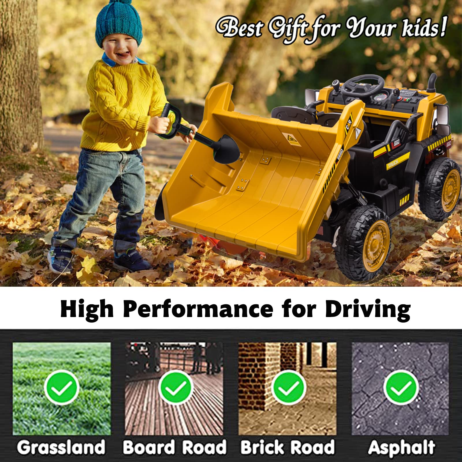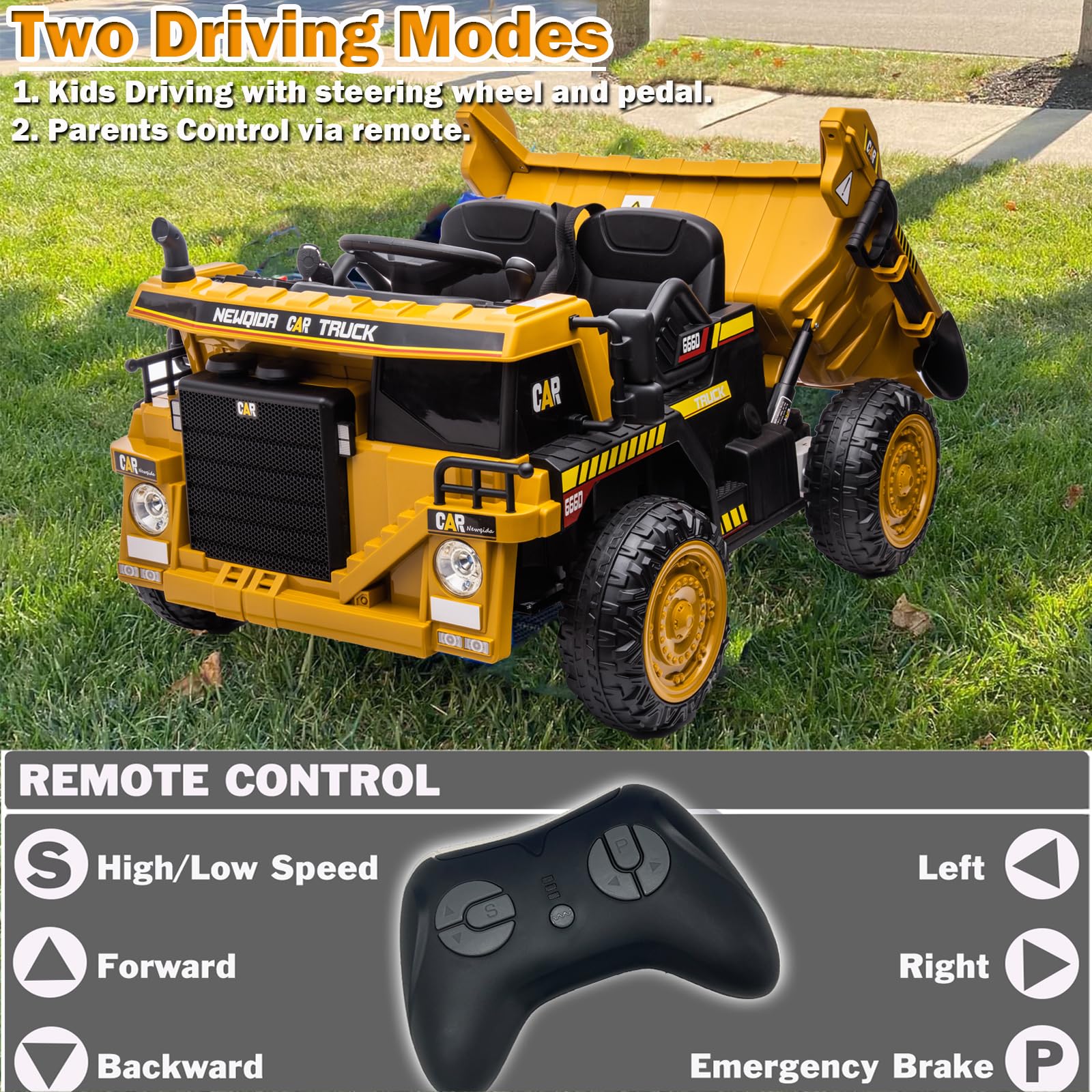 - u3010Functional Construction Truck Vehiclesu3011Easy to start by one key. This electric construction vehicle features music, horn, headlights, high/low speed function and phone connections, which enables the kids can enjoy the rear driving experience with this car.